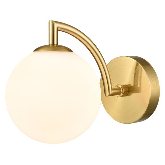 Aged brass finish single wall light with a curved arm that complements the sphere shaped opal glass. This versatile range is available in four colours and two designs of glasses. Suitable for use in every bathroom zone except zone 0. Rated IP44.
