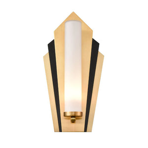Art deco style wall lights in gold and matt black with an opal glass cylinder.