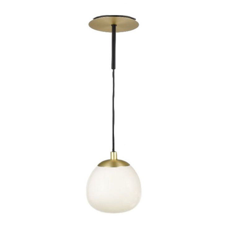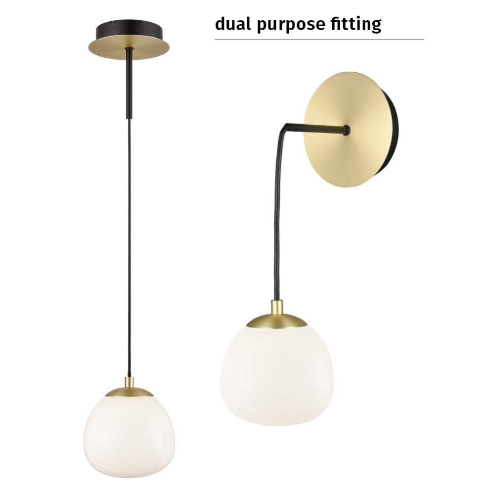 Matt black and gold finish pendant with opal glasses. The single fitting is supplied with an adjustable cable and can be used as a pendant or wall bracket.