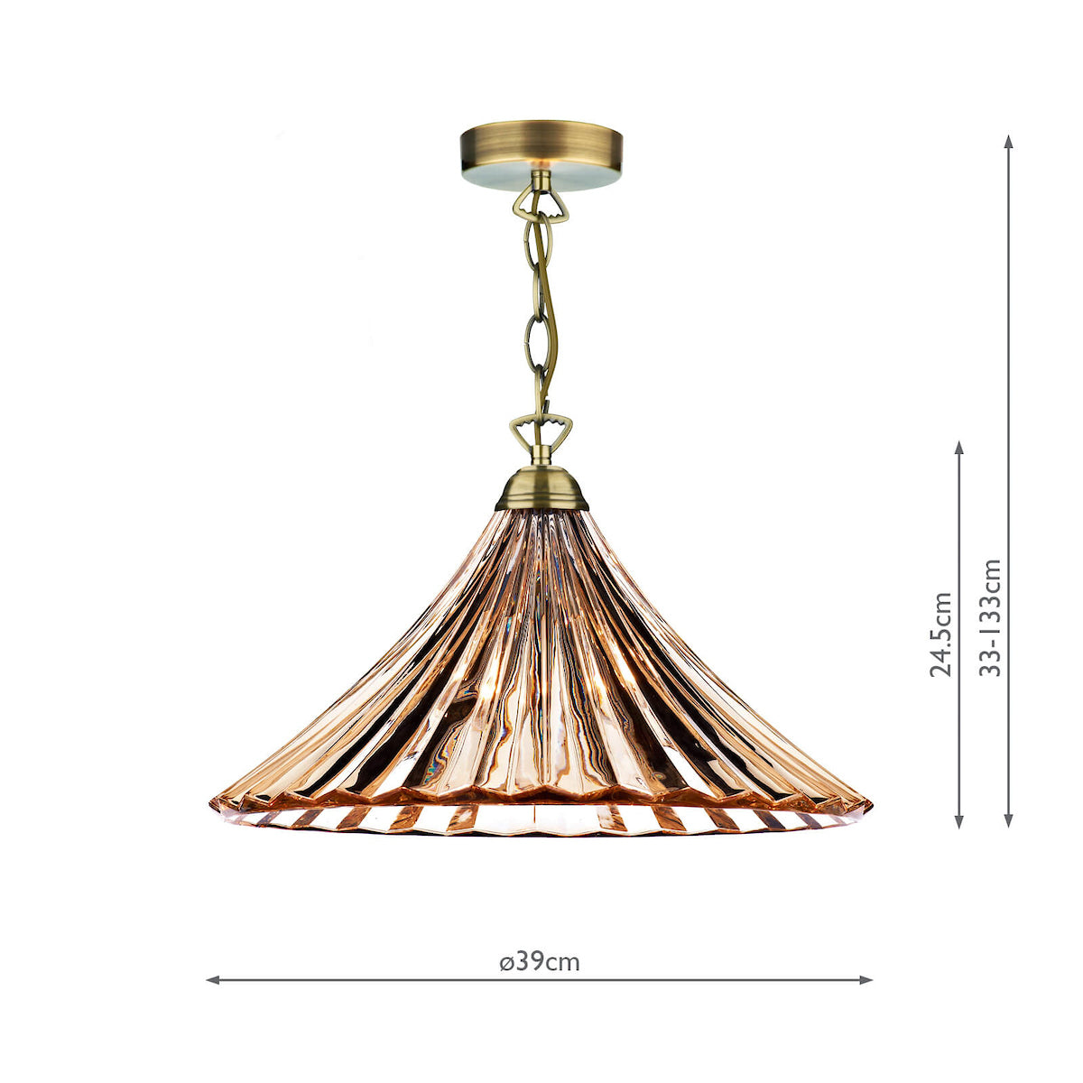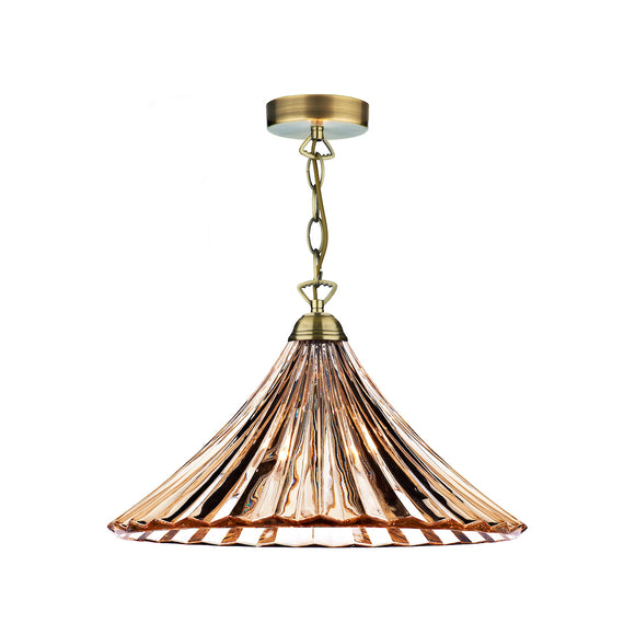 This 1 Light Pendant features an antique brass ceiling plate and a amber fluted glass shade.