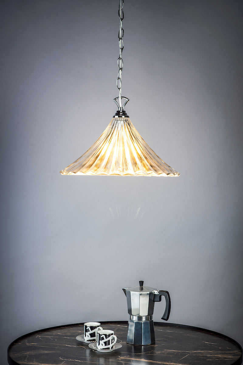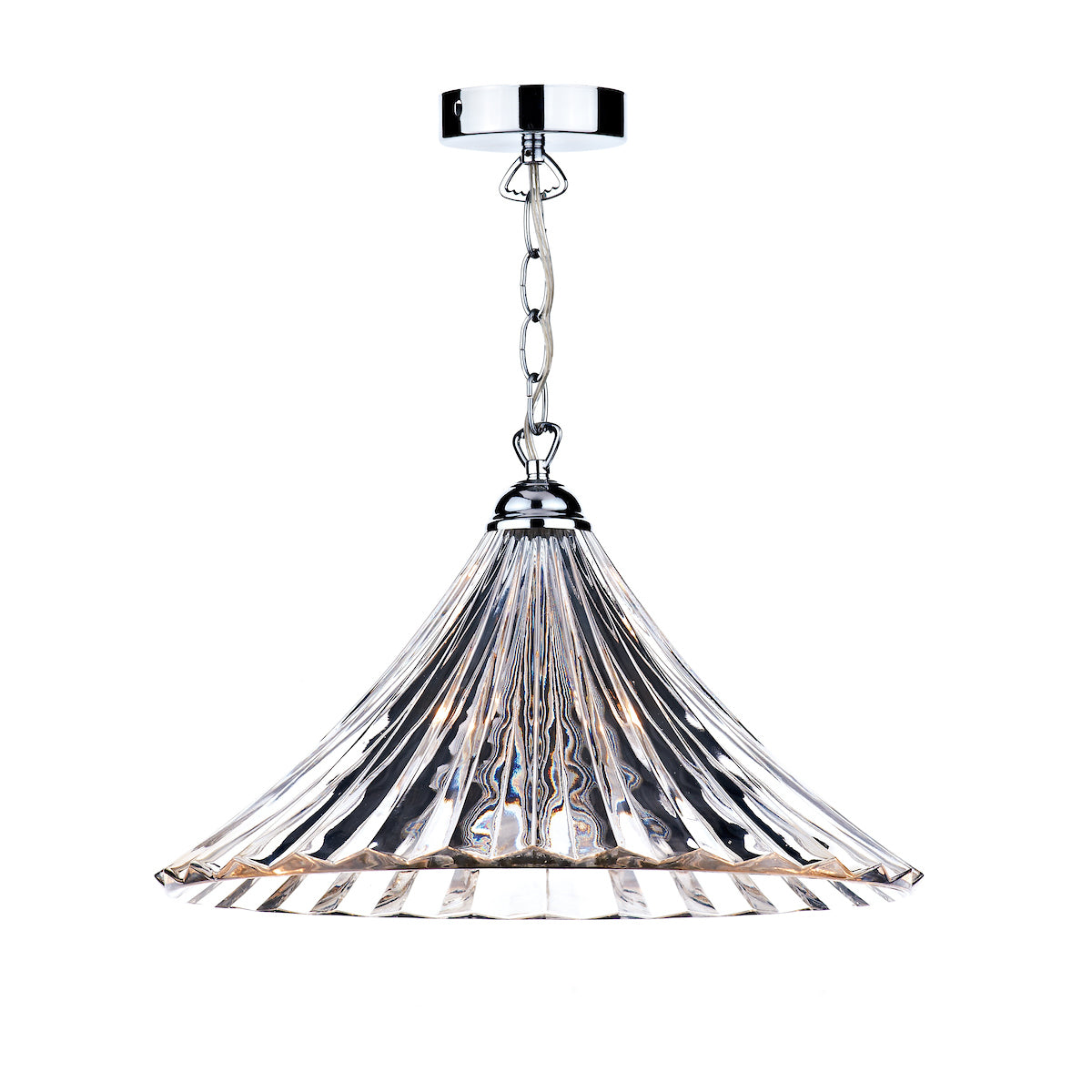The French-inspired ceiling light features a flared and fluted clear glass pendant shade and a polished chrome ceiling plate.