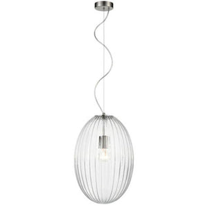 Impressive oval ribbed pendants in matt opal, smoked or clear glass on satin nickel suspensions and available in 2 sizes.