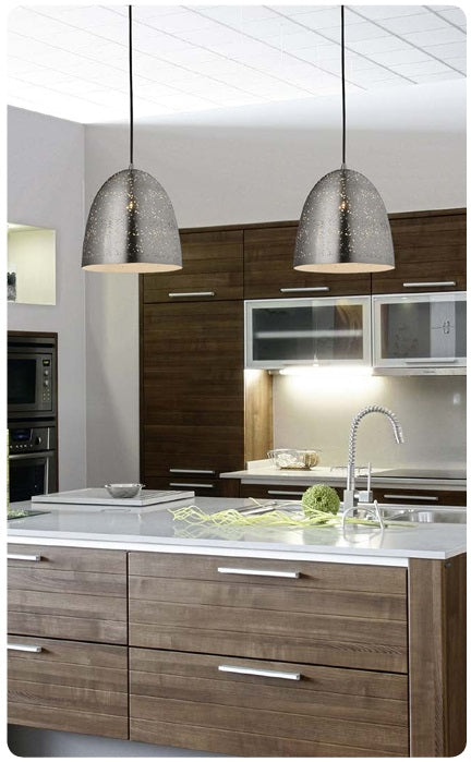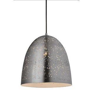 Metal pendant manufactured using a special process which produces a mass of randomly shaped small holes through which light spills when illuminated to give a stunning effect on walls and ceilings.