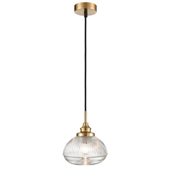 Brushed brass finish pendant with clear ribbed, enclosed glass with a slightly inverted base.