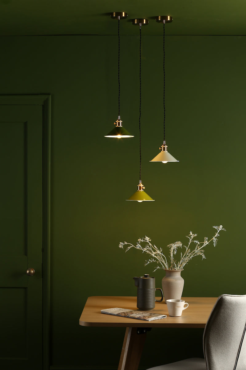This all-metal version has a vintage-look cone shade in a soft cashmere finish and white inner, complemented by a sophisticated brass finish ceiling rose and machined lamp holder.