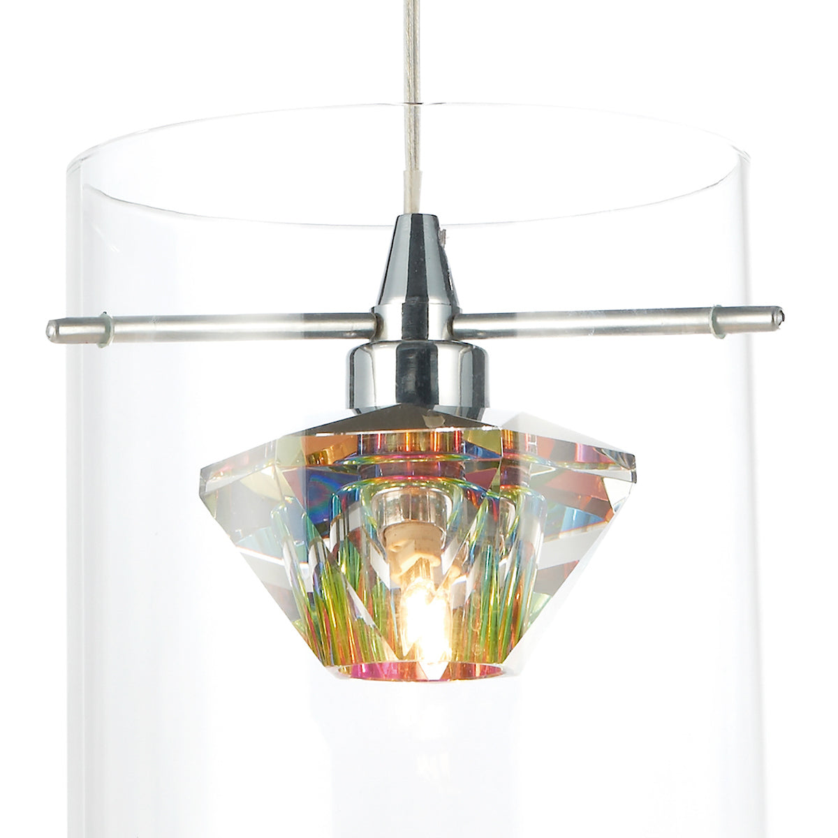 This Pendant has a dichroic glass inner shade and a clear glass outer surround. The fitting is fully height adjustable at point of installation.
