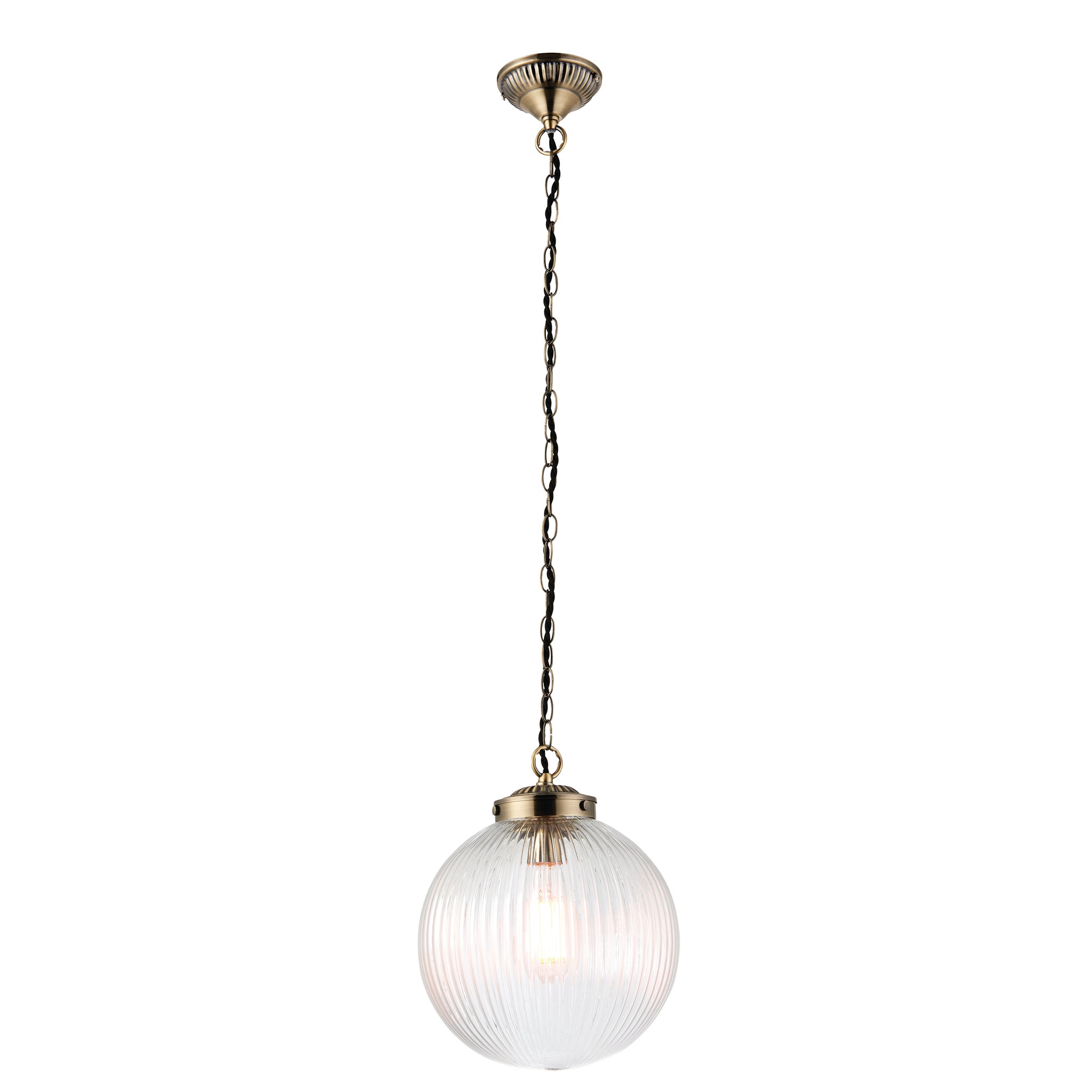 This ceiling pendant features a ribbed round glass shade hanging from a decorative chain finished in antique brass. Compatible with LED lamps, this fitting can also be dimmed. Choice of size available