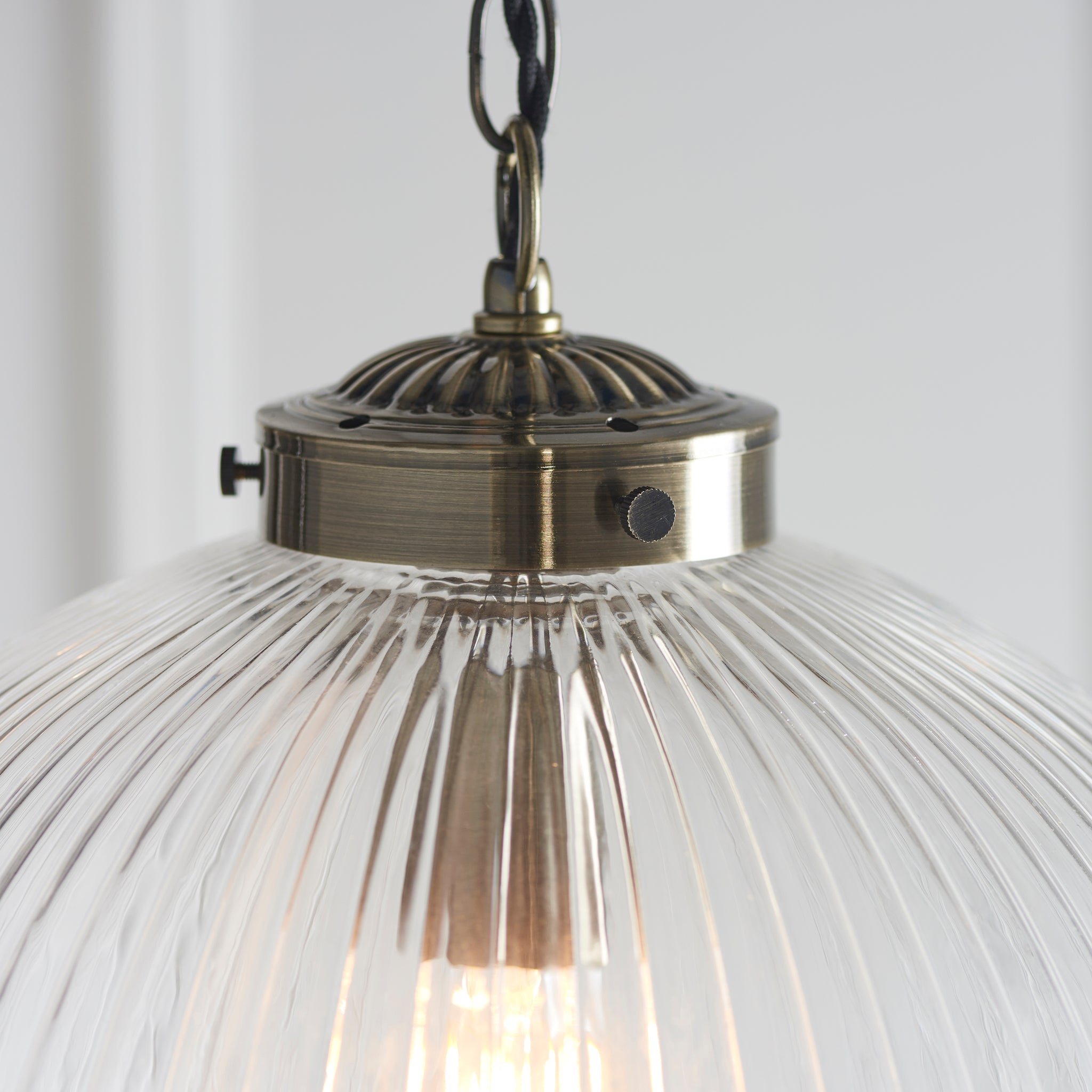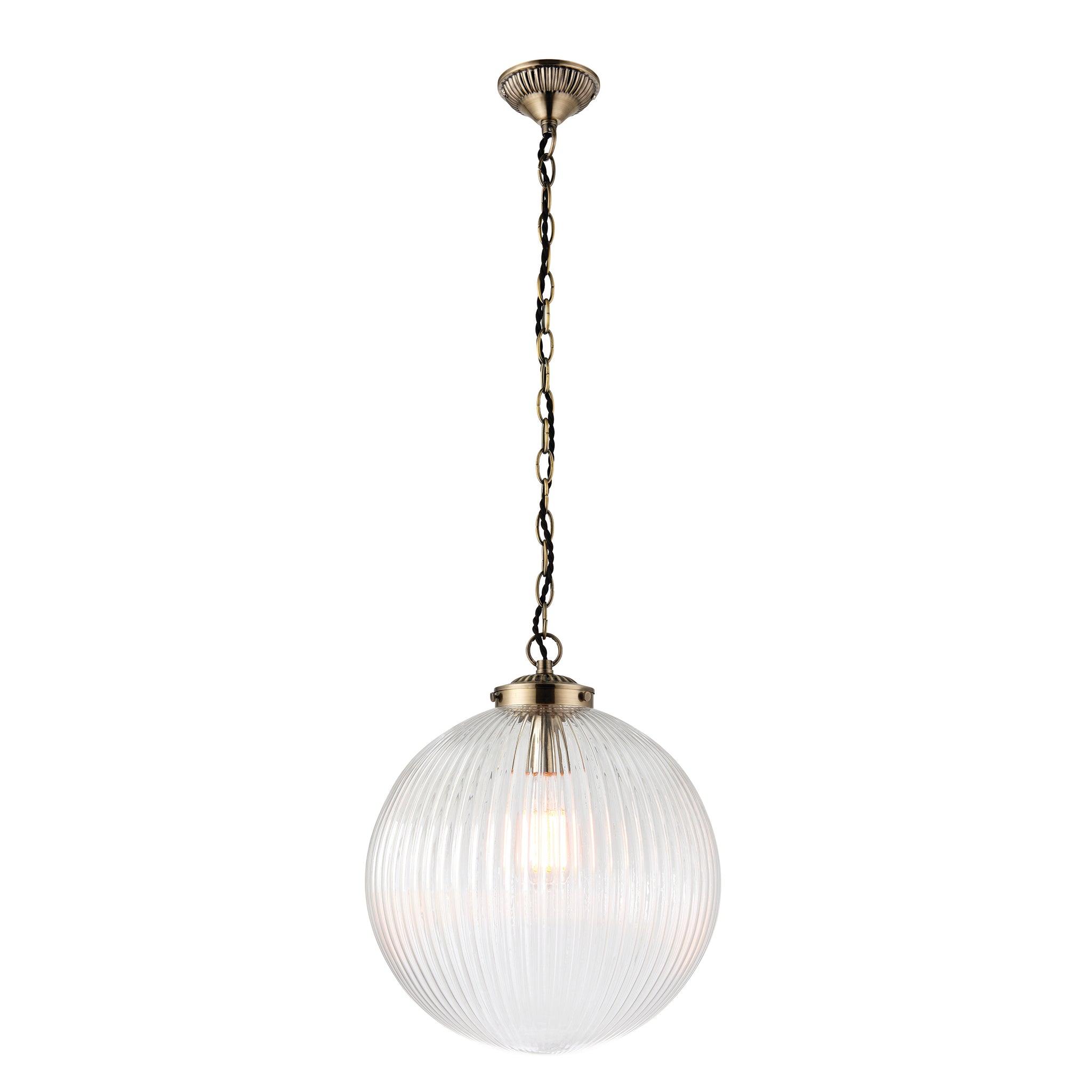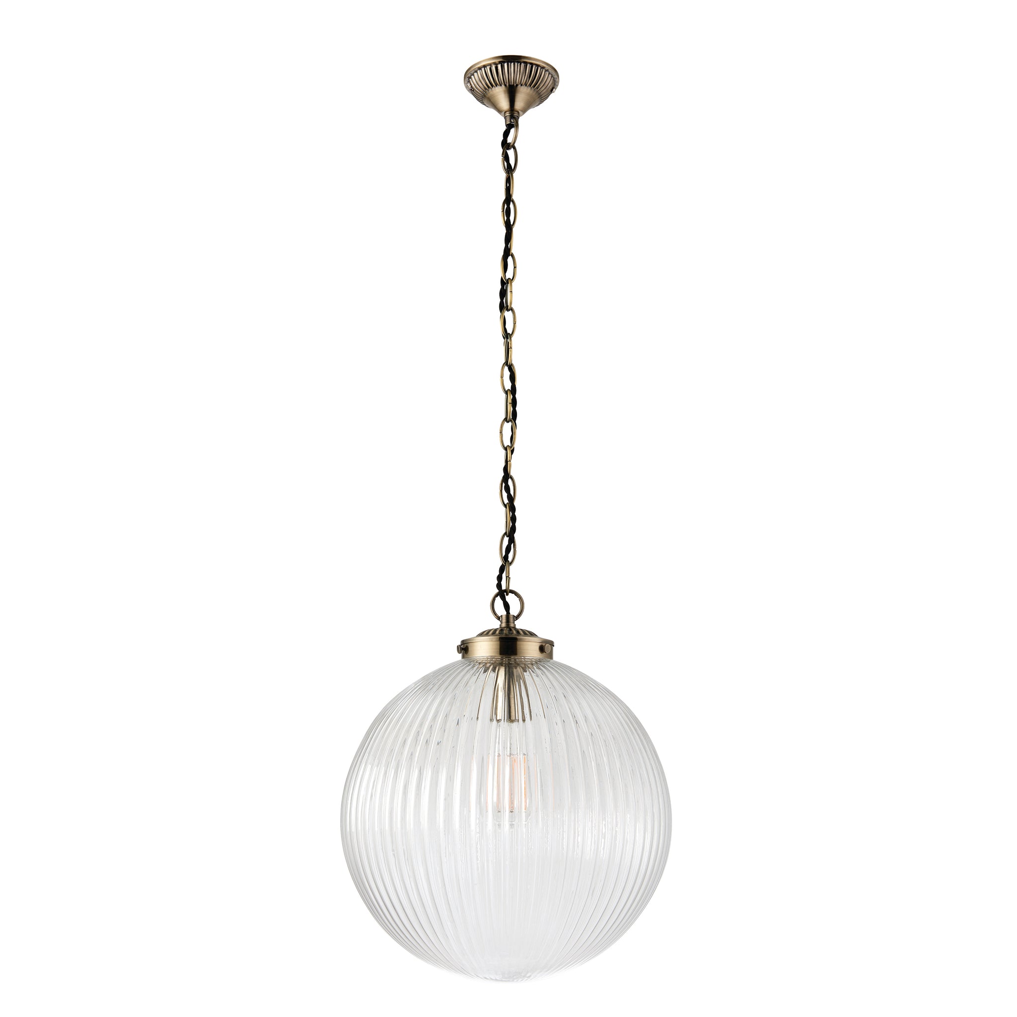 This ceiling pendant features a ribbed round glass shade hanging from a decorative chain finished in antique brass. Compatible with LED lamps, this fitting can also be dimmed. Choice of size available