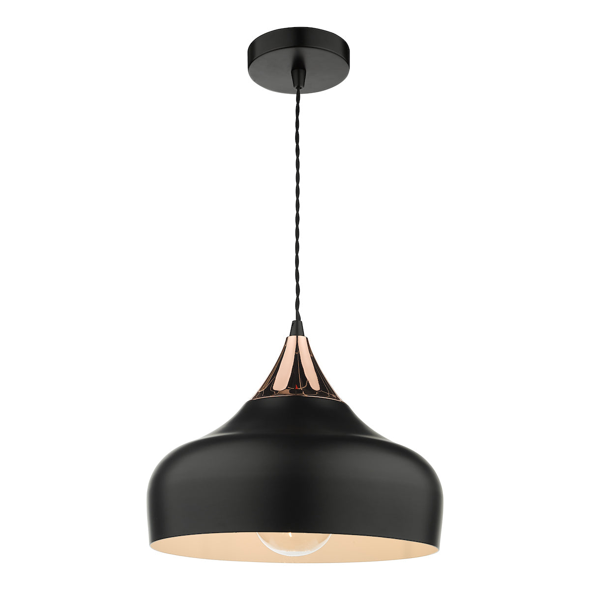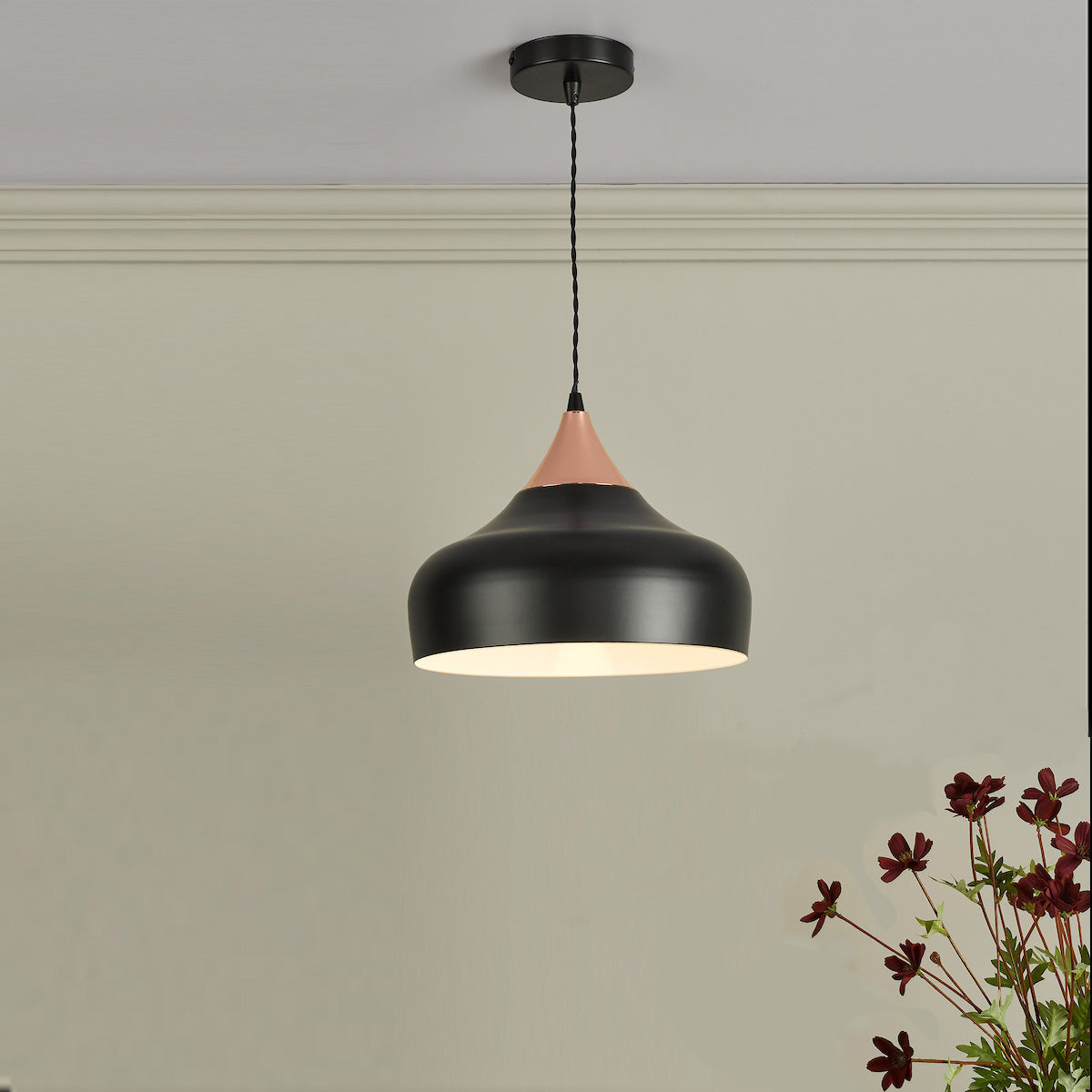 Suspended by a coordinating black twisted braided cable, which is height adjustable on installation to a minimum height of 24cm which is suitable for most ceiling heights (max 130cm).