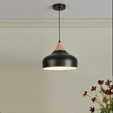 This single pendant features a gently curved metal shade with a matt black finish topped with contrasting polished copper. The inside of the shade is painted in white to reflect a useful pool of light.