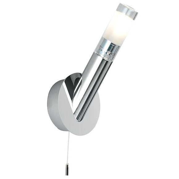 This 1 light modern bathroom wall light has a polished chrome finish and comes complete with an acid and clear glass shade. It comes with a pull switch to turn the light on/off independently. This 1 light modern wall light is IP44 rated so is suitable for use in a zone 1 area in the bathroom.