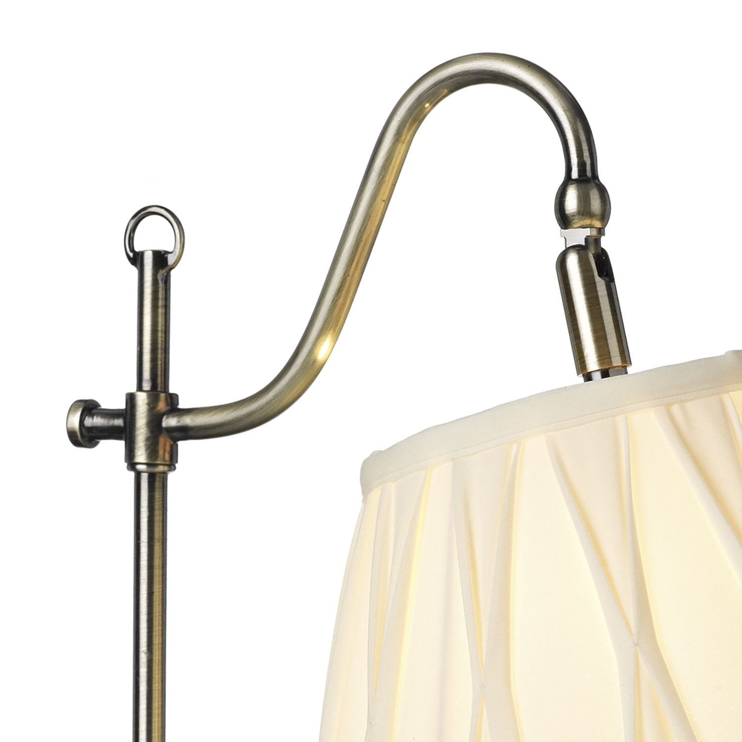 This traditional Rise & Fall Table Lamp is finished in antique brass, has a cream faux silk pinch pleat tapered directional shade, and is in line rocker switched. The height is also adjustable.