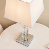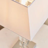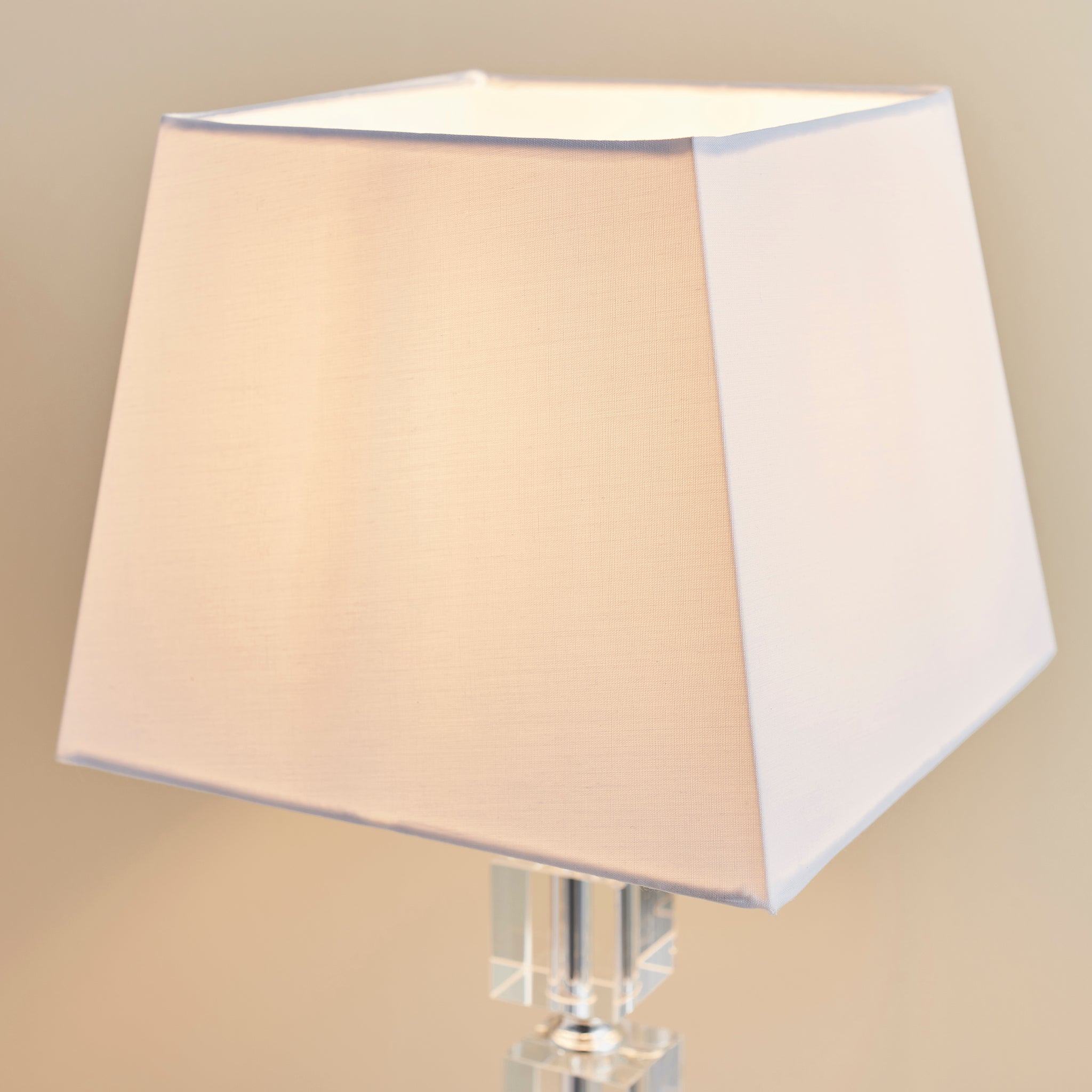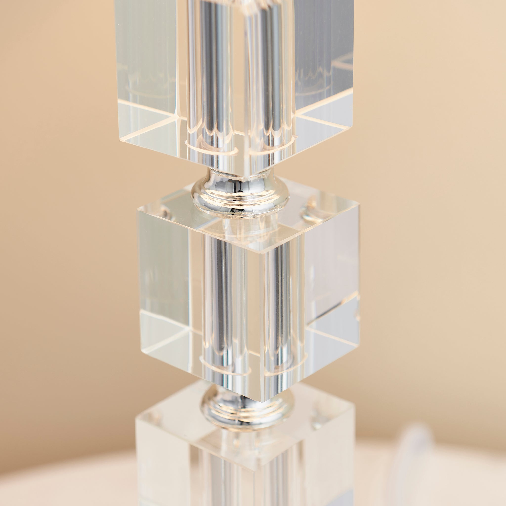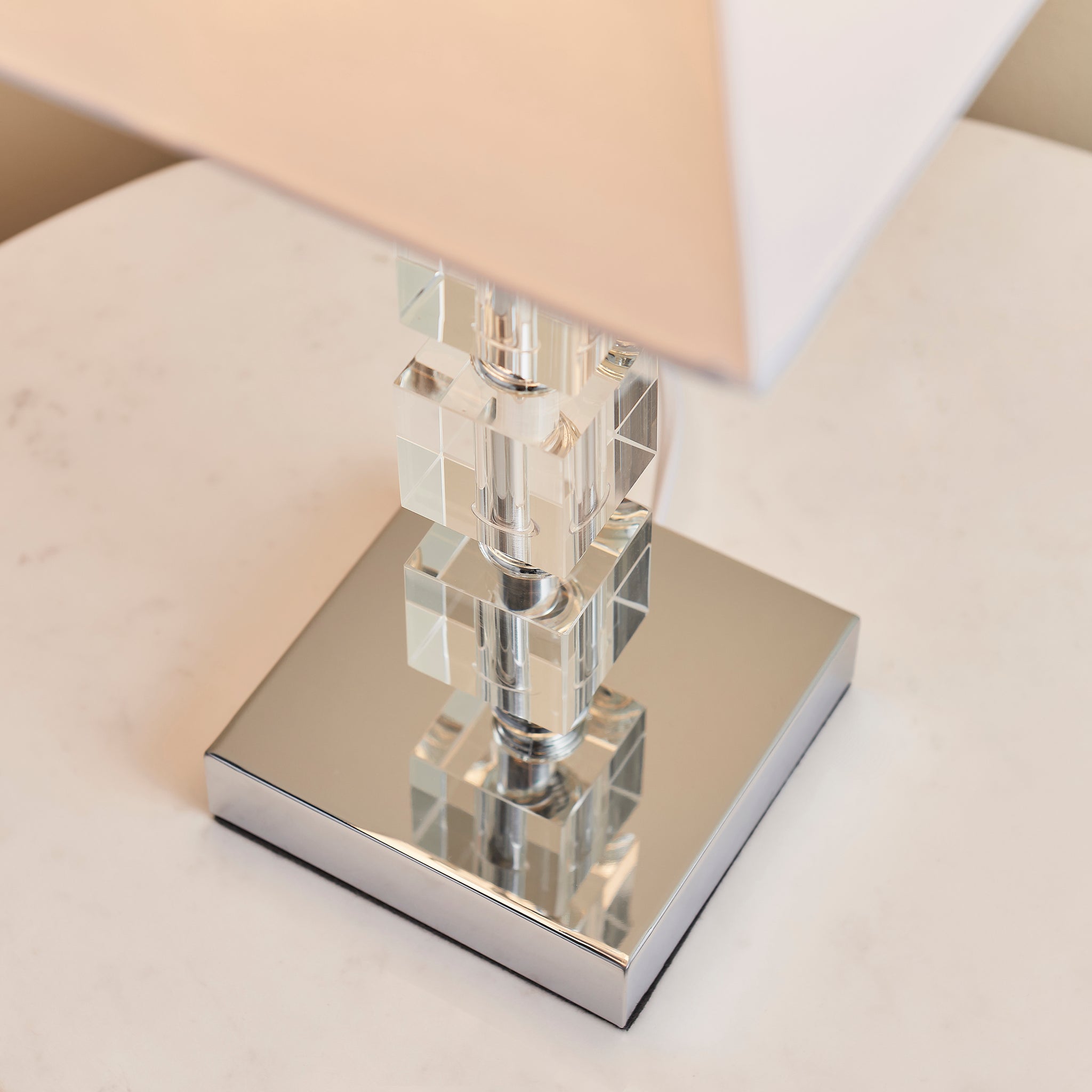 This table lamp has a polished chrome finish and a stem made up of stacked acrylic cubes with a cream fabric shade. Suitable for use with LED lamps and supplied with inline switch. It's the perfect size as a bedside table lamp, fitting a variety of decors.