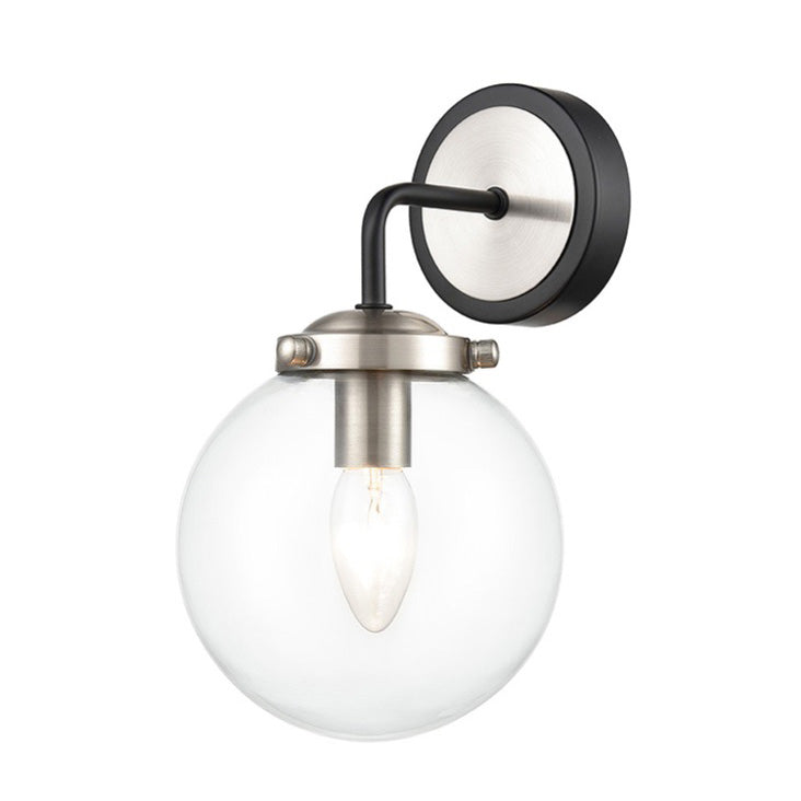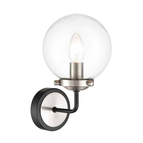 A single-lamp wall bracket in matt black and satin nickel with a clear glass sphere. This wall bracket can be mounted facing up or down.