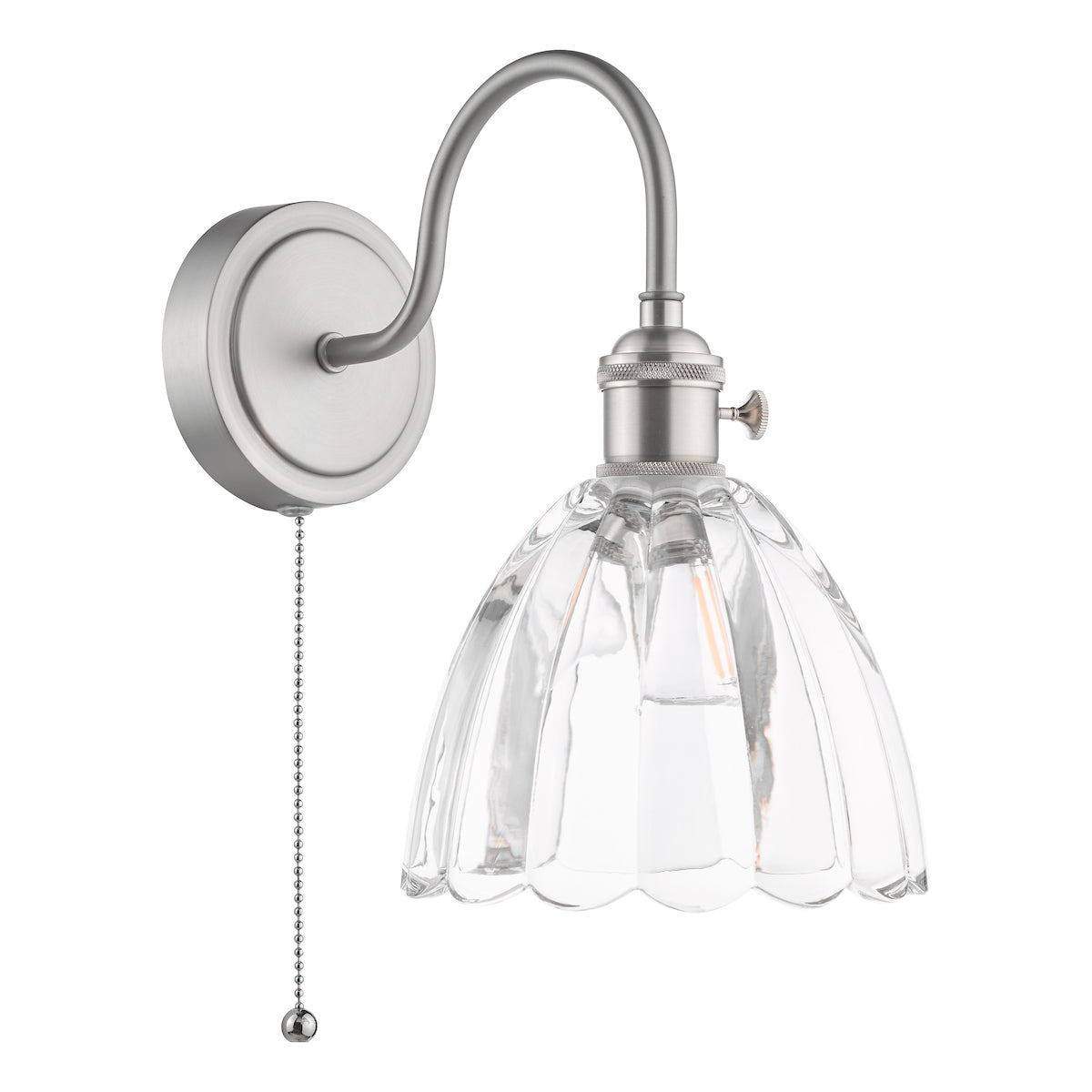 Illuminate your space with vintage charm using this antique chrome and glass wall light. This elegant Wall Light features a ribbed scalloped glass shade that diffuses light beautifully, creating a warm and inviting ambiance. The antique chrome finish adds a touch of sophistication, making it a versatile choice for both traditional and modern interiors. Practicality meets style with its convenient metal pull cord switch, allowing for effortless operation. Need to clean or maintain? No worries - this wall light can be easily removed without fuss. Whether you're looking to brighten up a cosy bedroom corner or add ambient lighting to your hallway, this Wall Light is the perfect blend of timeless design and functionality.