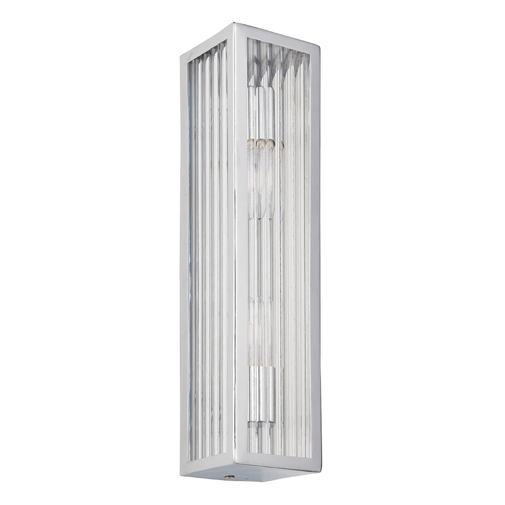 Simple yet stylish contemporary wall light with chrome plate finish and clear ribbed glass diffuser. Dimmable and IP44 rated ideal to create a relaxing ambient light in any bathroom. Smaller size also available.
