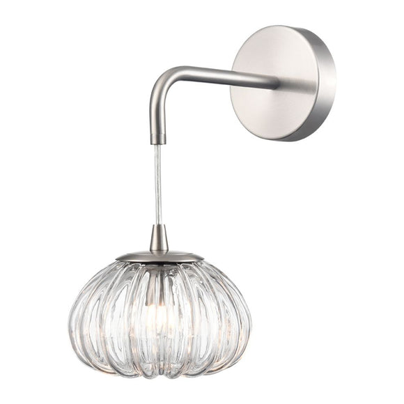 Satin nickel finish wall light with clear ribbed enclosed glass with inverted base.