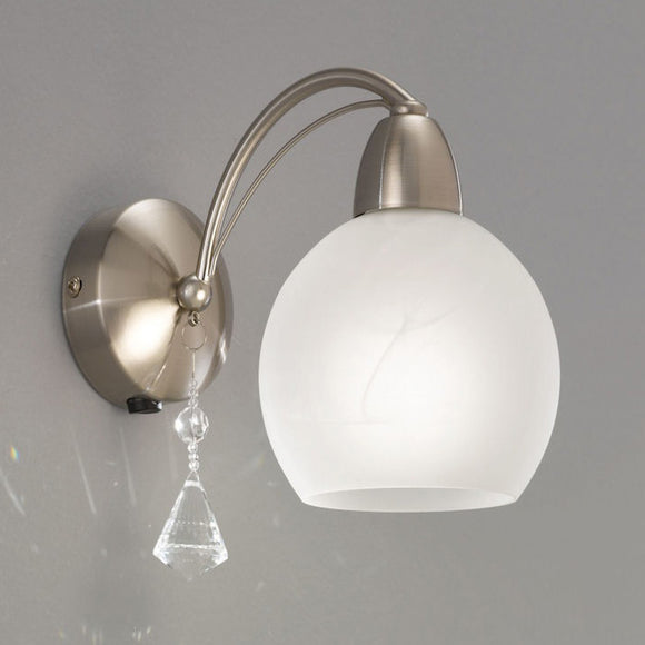 In satin nickel finish with an alabaster effect glass and a faceted crystal drop. There is a switch on the backplate.