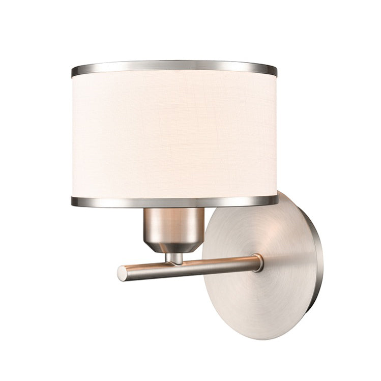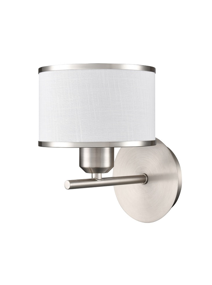A single wall light in satin nickel with a off-white textured fabric shade featuring matching trims.
