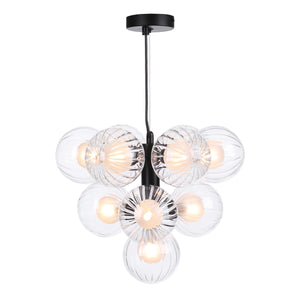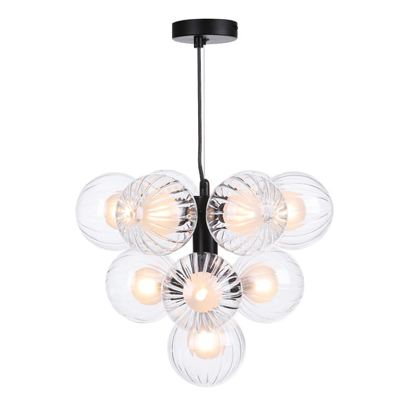 Introducing this 10 Light Pendant Satin Black & Duplex Glass – a masterful interplay of modern design and functional brilliance, ideal for enhancing your living room, dining room, or bedroom. Crafted to perfection, this pendant light boasts duplex glass shades that combine a contemporary ribbed outer surface with an opal non-glare inner, creating a harmonious fusion of style and practicality. The shades provide a balanced diffusion of light, adding a layer of depth and warmth to your interior space. Suspended gracefully by a black braided cable, this pendant captures attention with its sophisticated presence.