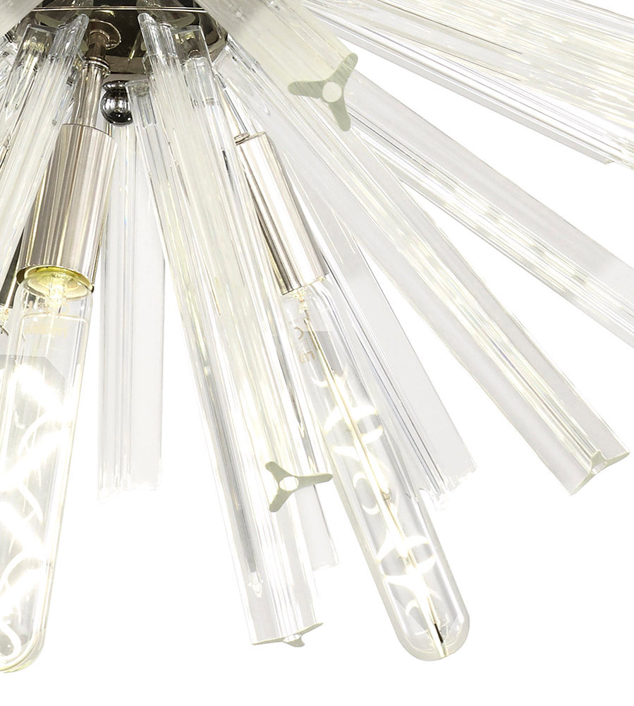 The collection presents an intriguing glass shape moulded into a three dimensional triquetra. The grooves along each sized glass create an appealing optical effect which is effortlessly enhanced with the use of tubular lamps. The wide variety of fixtures available in this range span from a 6 light semi flush to an impacting 32 light pendant. The complementing wall lamps available allow for further application built around the same lighting family. Each frame can be chosen with either a brown oxide, polished nickel or matt black frame with either clear, champagne gold or smoke glass.
