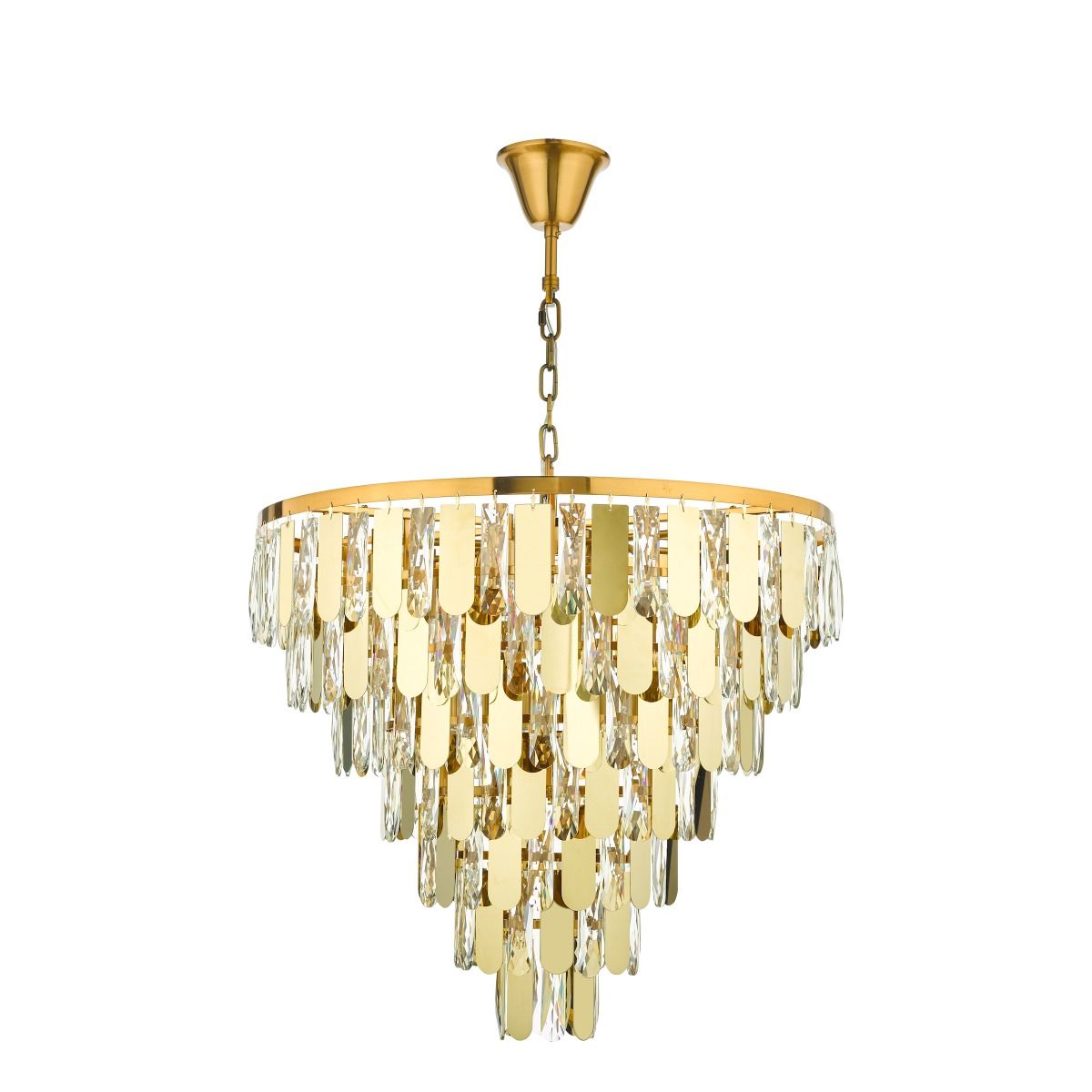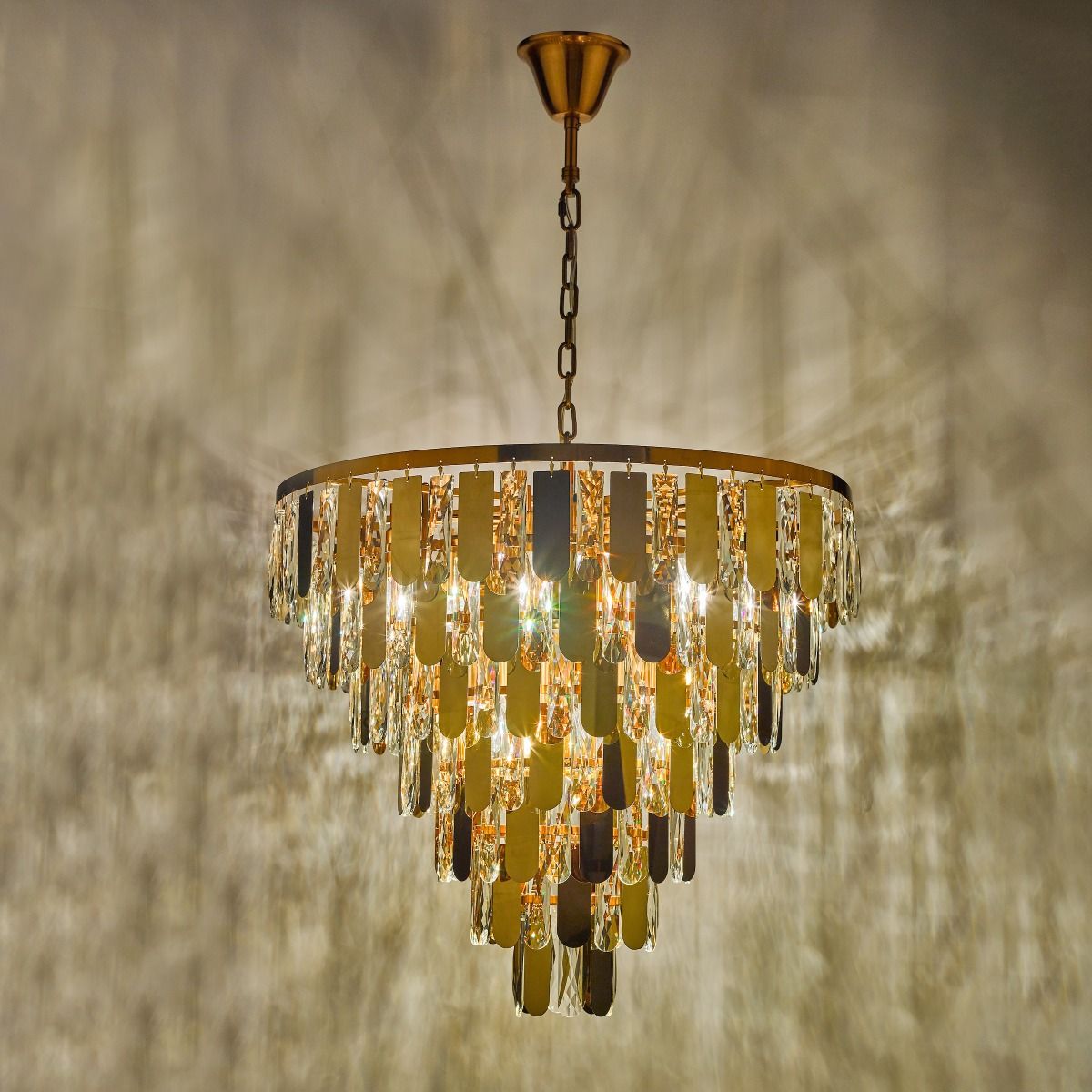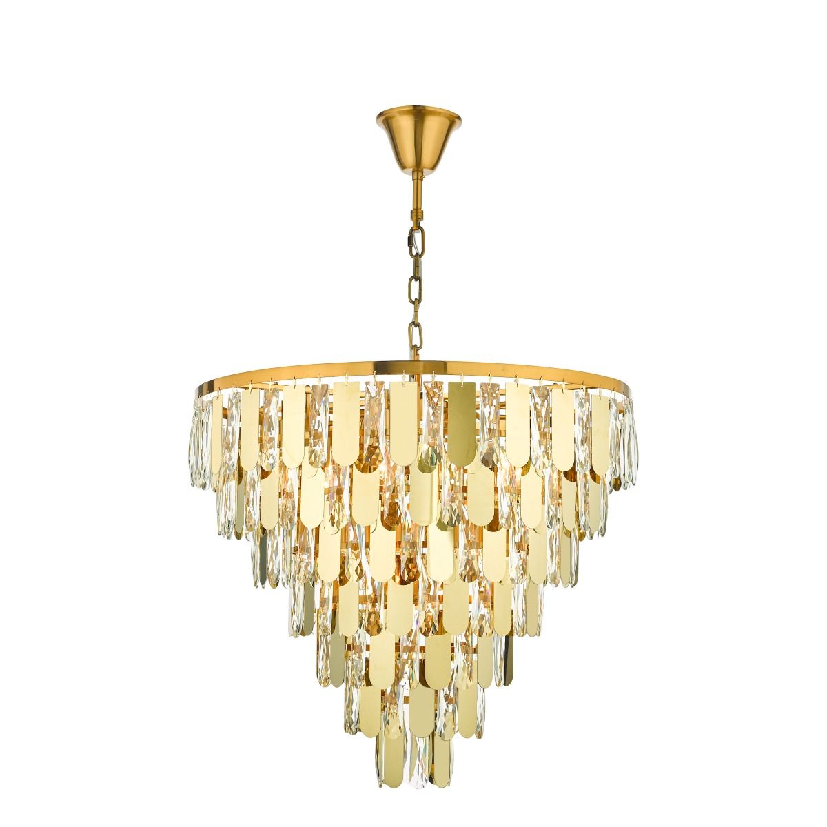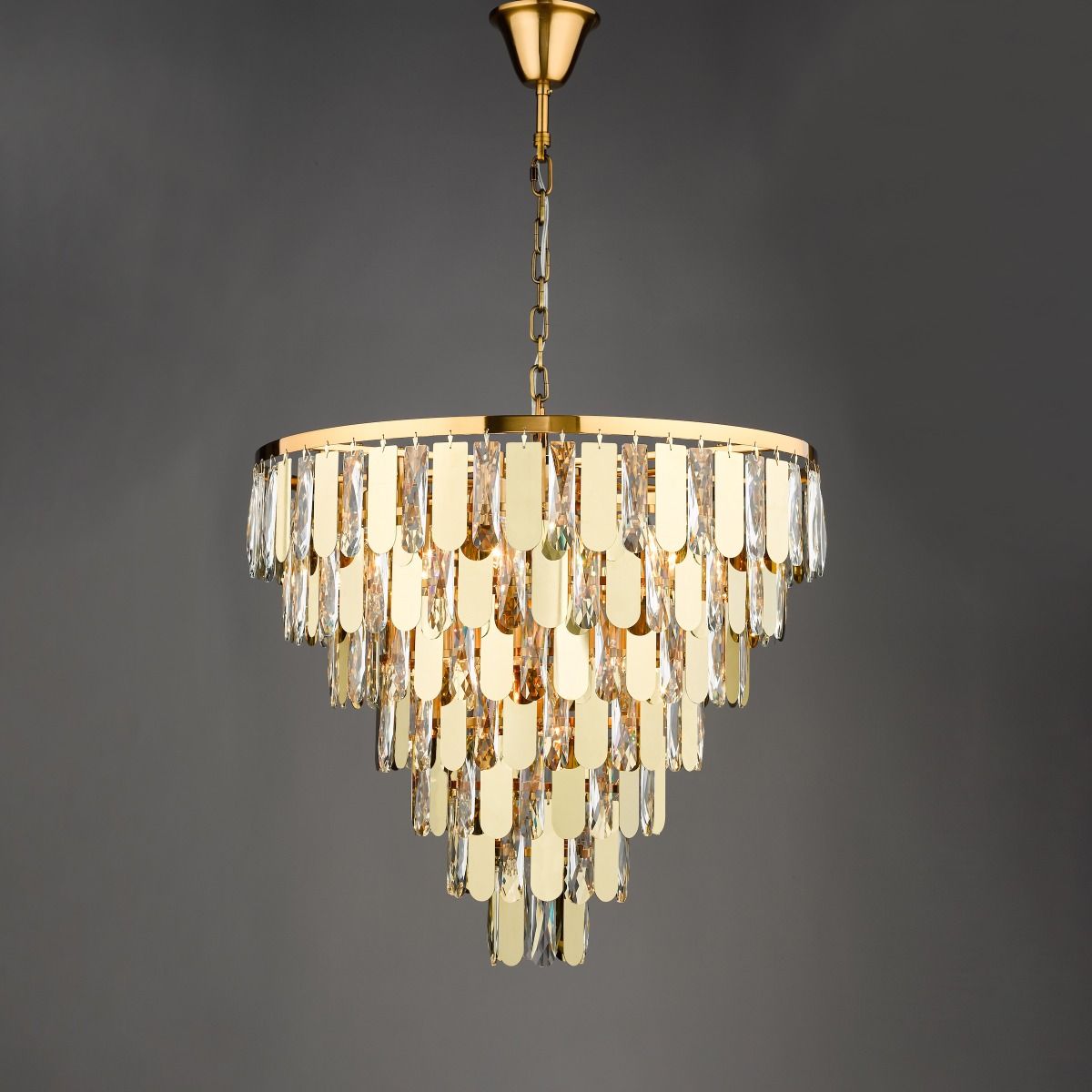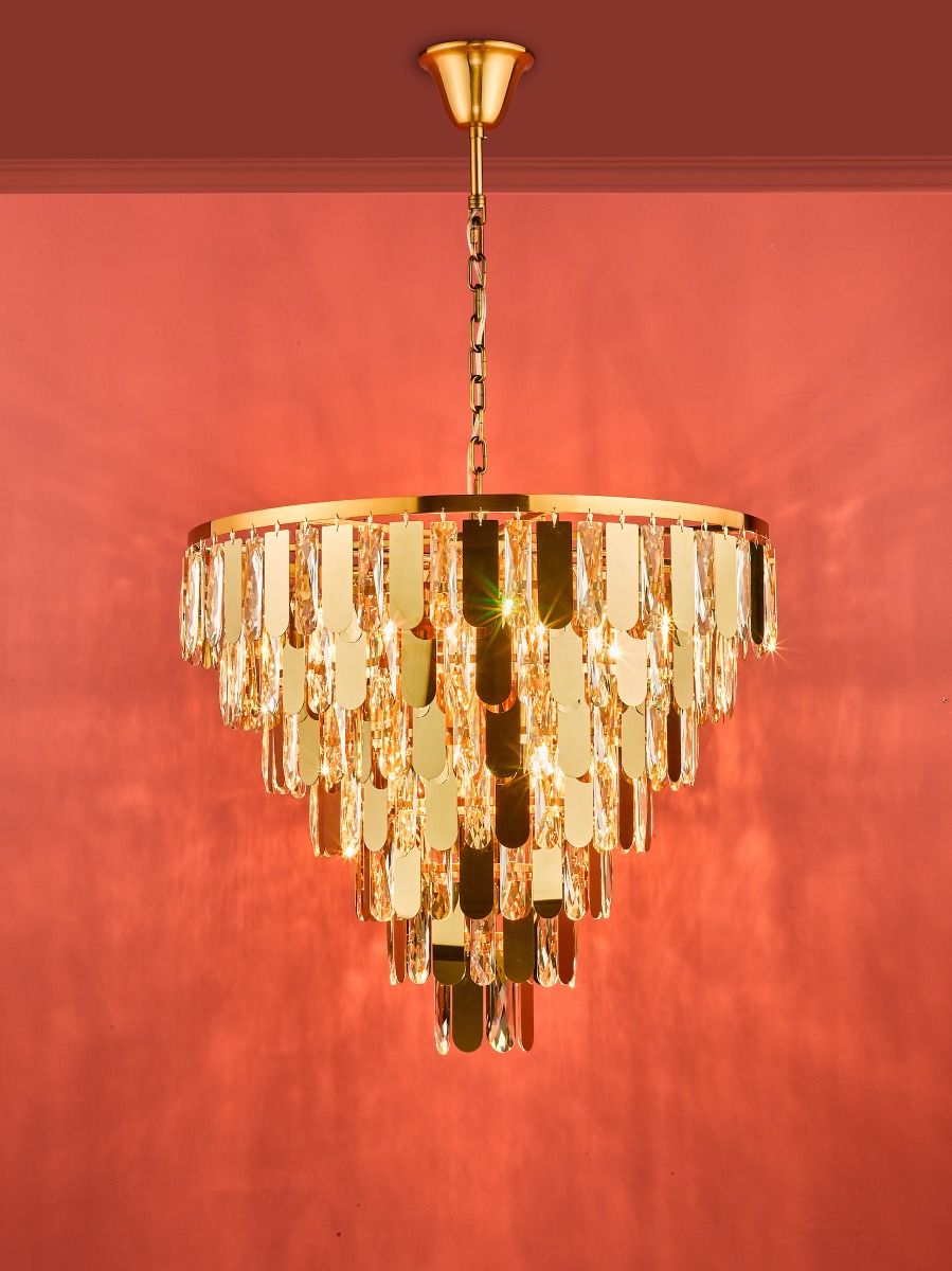This impressive ceiling chandelier features a polished gold finish mixed with faceted crystals in a modern scallop shape, that catch the light beautifully when the light is on or off. Match with wall light to create outstanding look for your interiors.