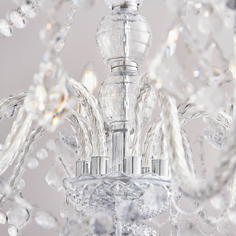 A 12 light chandelier with clear acrylic beading, facets and droplets. Comes with a fully adjustable chain to extend the drop of the light up to a maximum 1.8m. Also available in 2 sizes