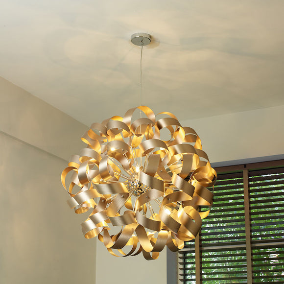 The 12 Light Pendant features twirling ribbons of brushed copper around a polished chrome frame.