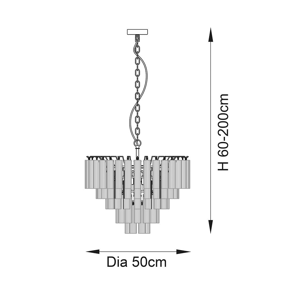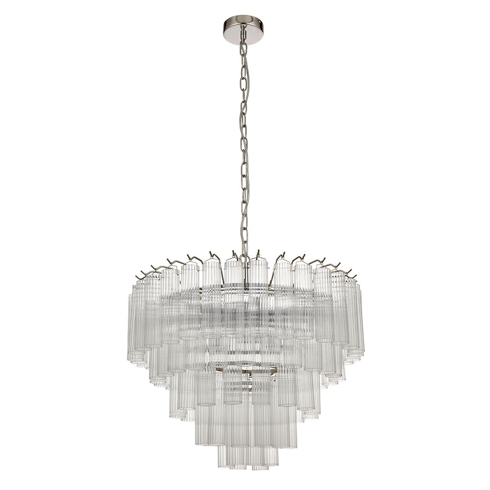 Show stopping tiered tubular glass chandelier with fine ribbed cylindrical clear glass set amongst polished nickel metalwork. A stunning focal piece to light up an interior space with grandeur.