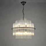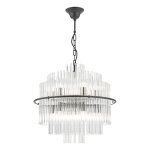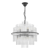 This13 Light Pendant, a dazzling masterpiece crafted with hundreds of tiered glass rods, creating a captivating floating illusion within a satin black band. The height-adjustable design allows for customization, making it the ideal statement piece for any living area.