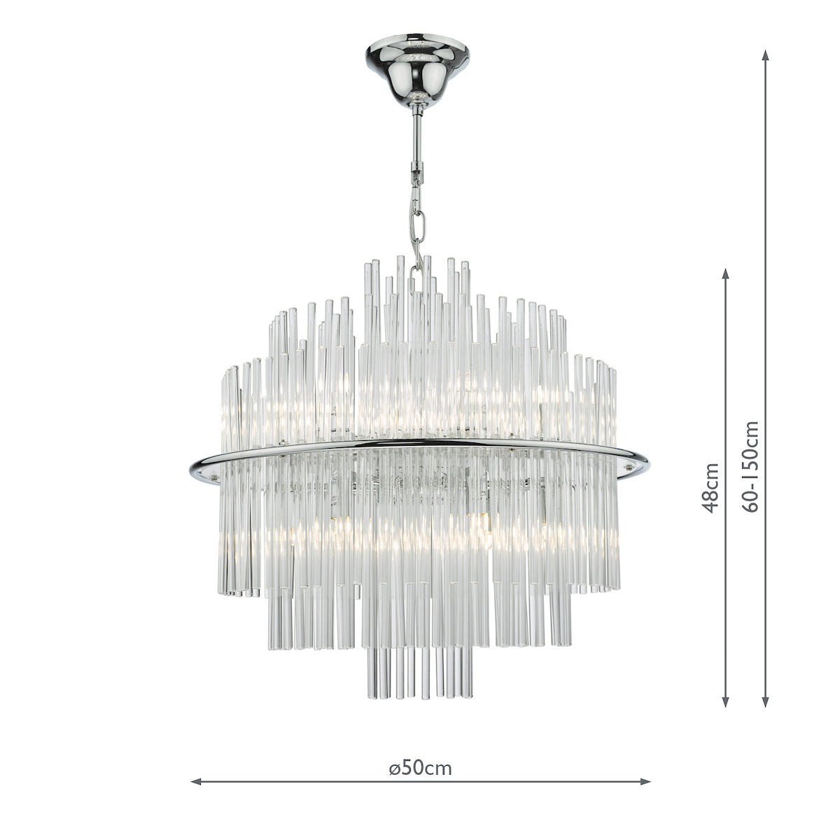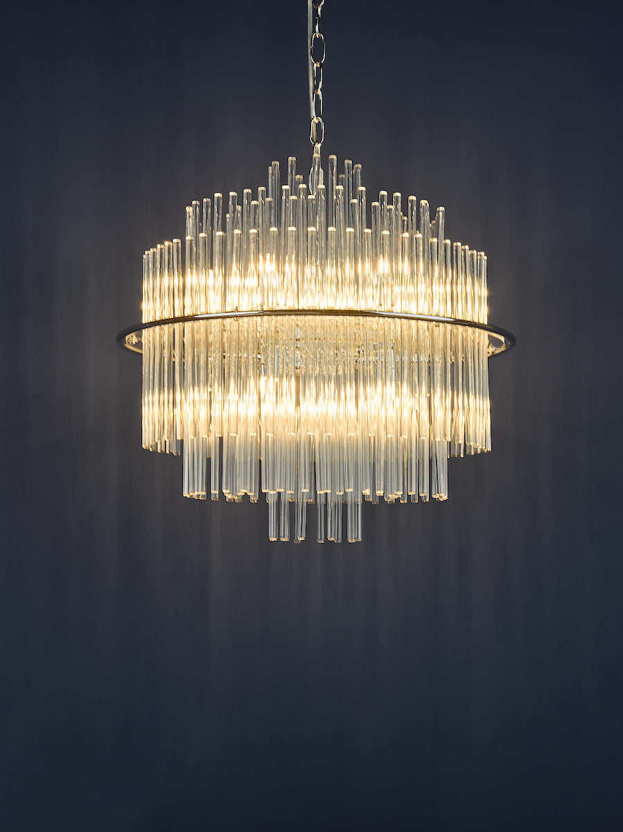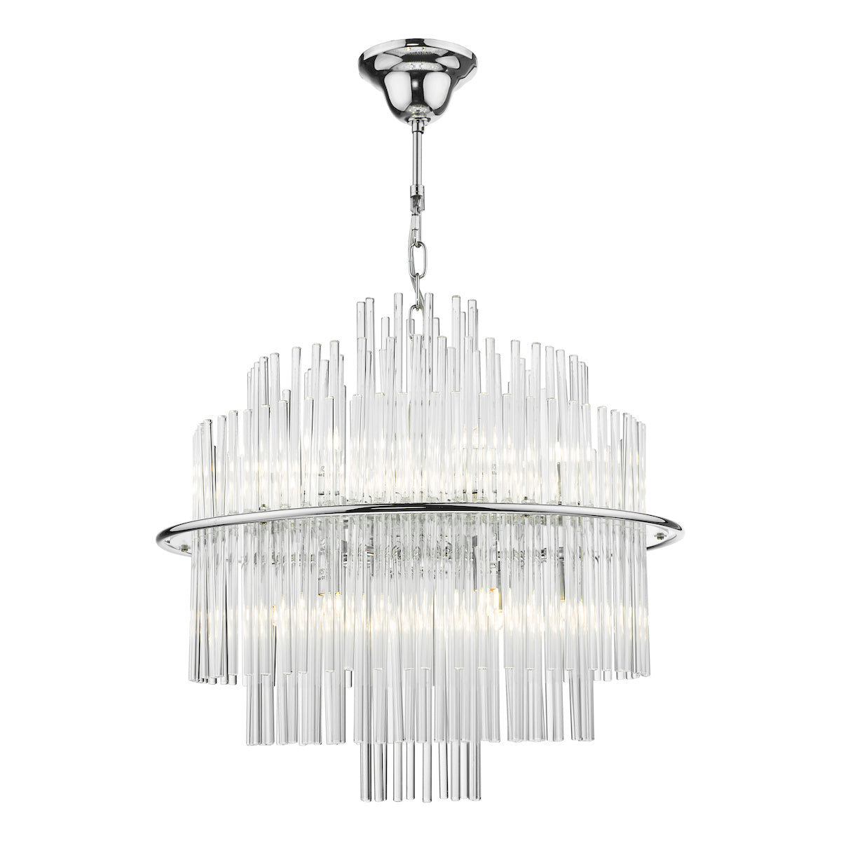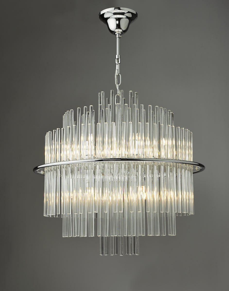 This 13 light Pendant in polished chrome consists of hundreds of tiered glass rods appearing to give a floating illusion inside a polished chrome band. This fitting is height adjustable and would make the perfect statement piece for any living area.