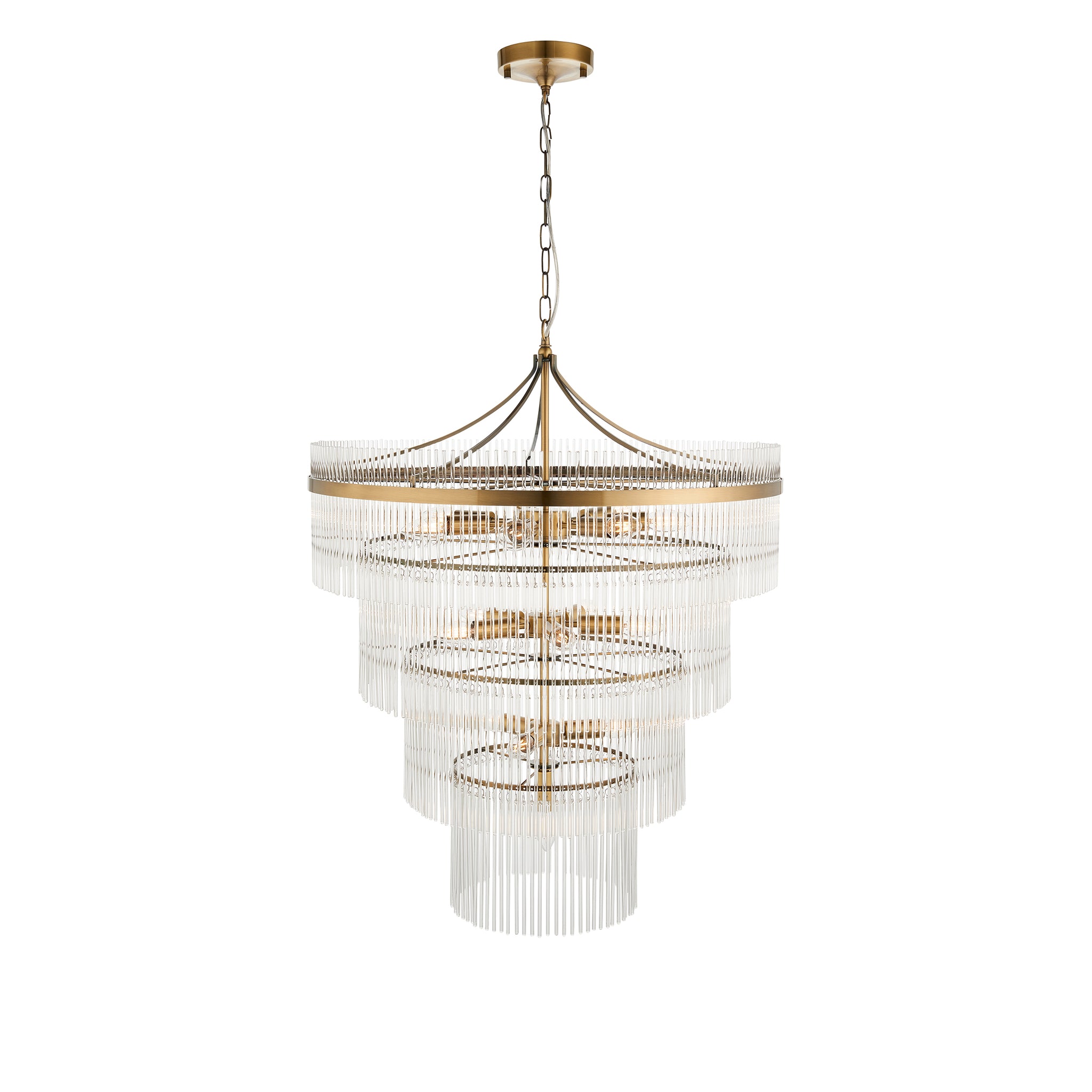 Create an impressive statement with this large 16 light tiered glass pendant, perfect for stairwells and high ceiling interiors. Finished in antique brass and decorated with clear glass rods that delicately diffuse the light, creating that classic iconic look.