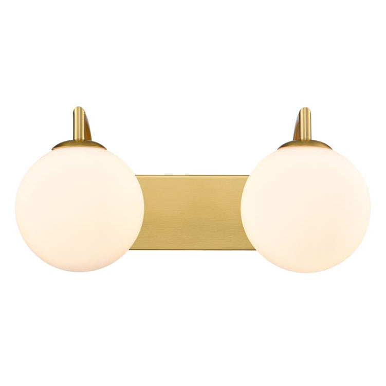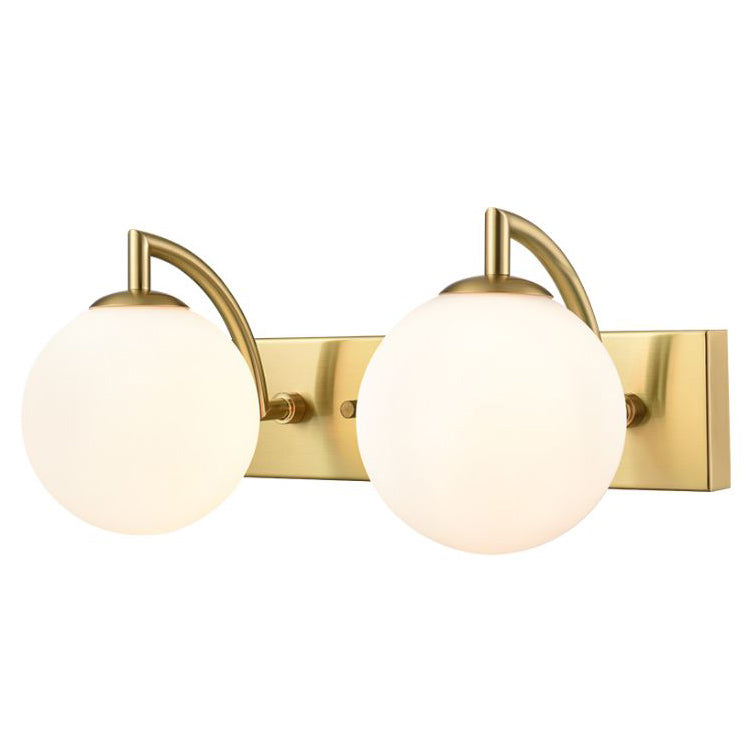 Aged brass finish double wall light with a curved arm that complements the sphere shaped opal glass. This versatile range is available in four colours and two designs of glasses. Suitable for use in every bathroom zone except zone 0. Rated IP44.