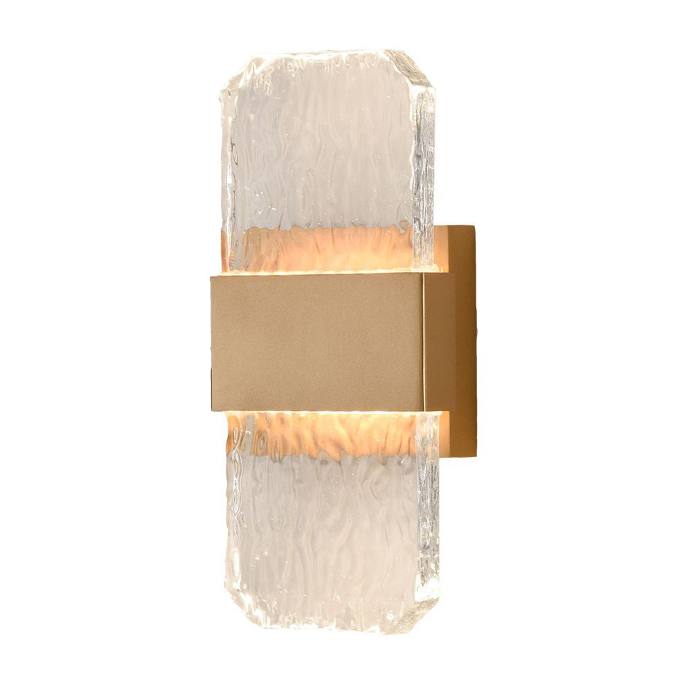 Aged brass finish wall light. The LED light source illuminates the clear artisanal cast glass. Suitable for interior and exterior use. Rate IP54.