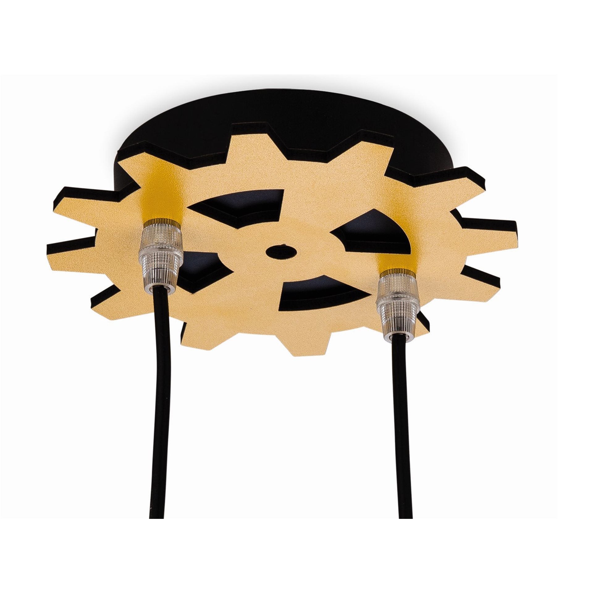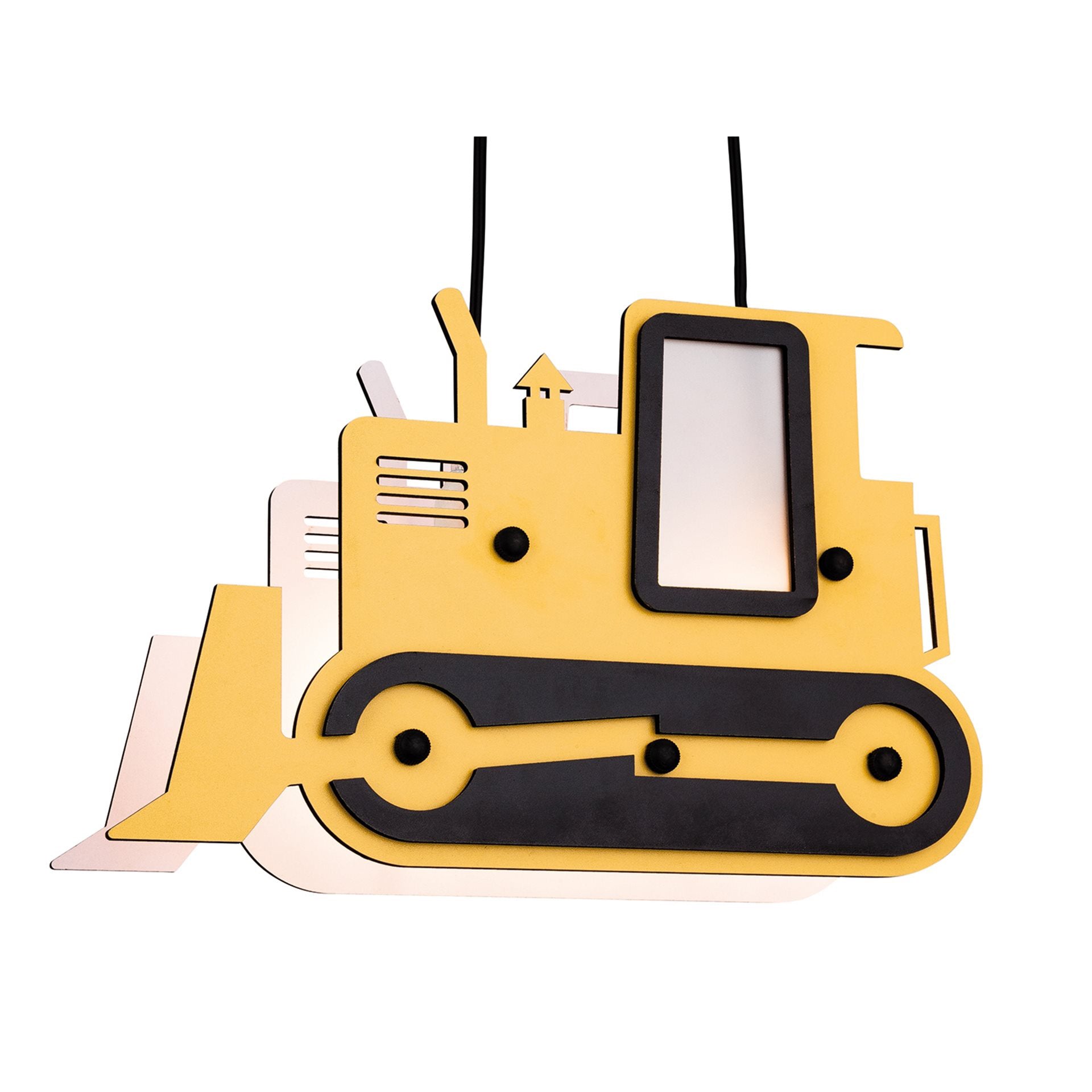 A bright yellow pendant light with black trim it features a bulldozer and is ideal for a child's bedroom or nusery.