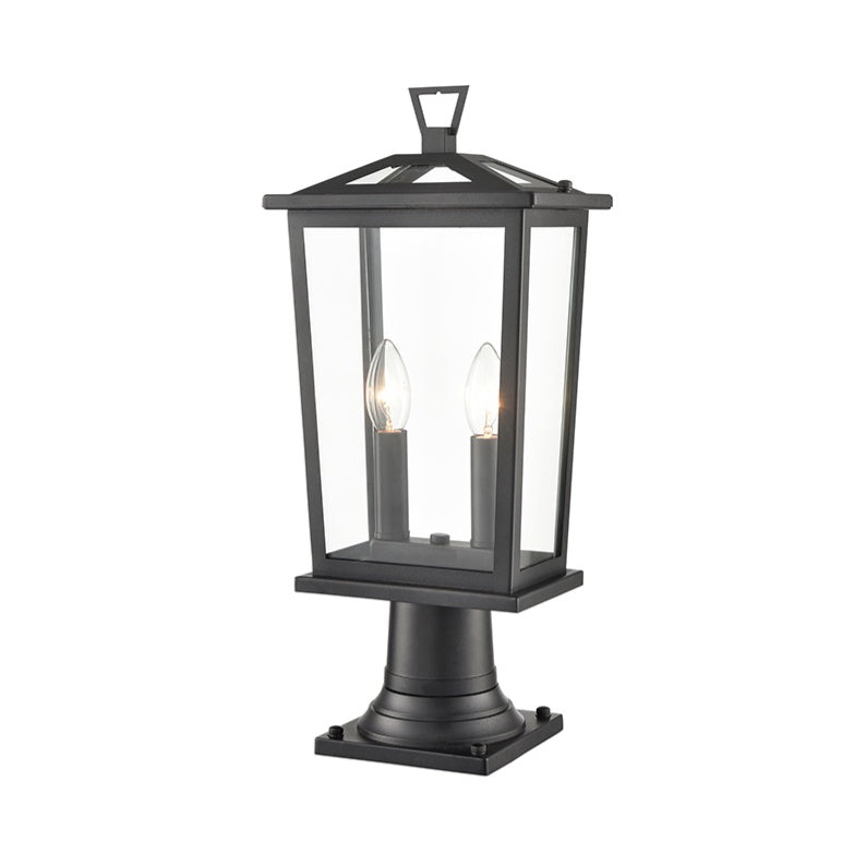 Matt black finish small 2 light pillar post with fully enclosed clear glass panels. Rated IP44.