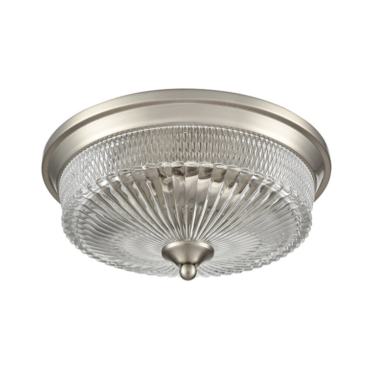A satin nickel finish flush ceiling fitting with decorative clear ribbed glass.