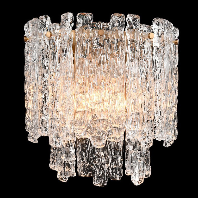 Aged brass finish wall light with ice cubed shaped glass panels at varying heights that refract the light.