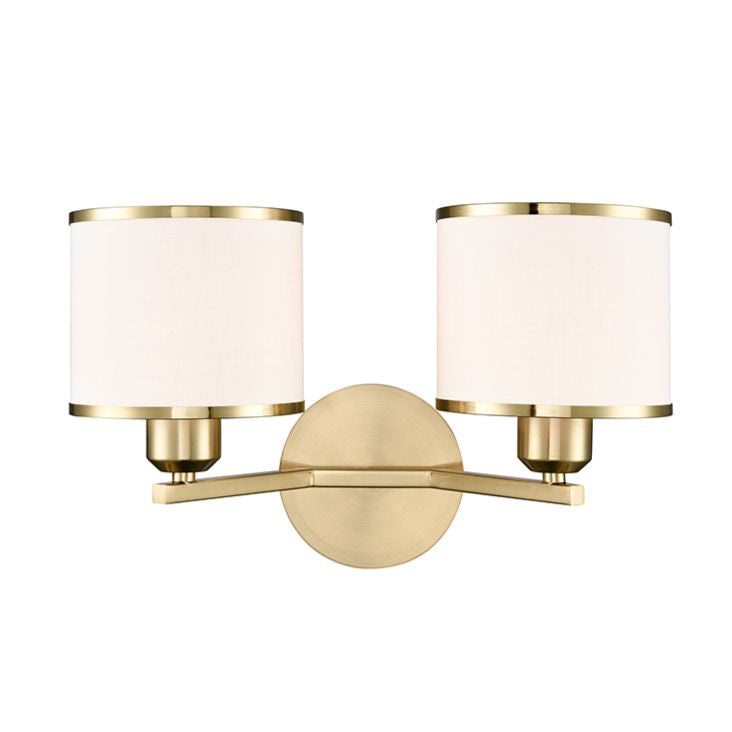 A double wall light in aged brass finish with off-white textured fabric shades featuring matching trims.
