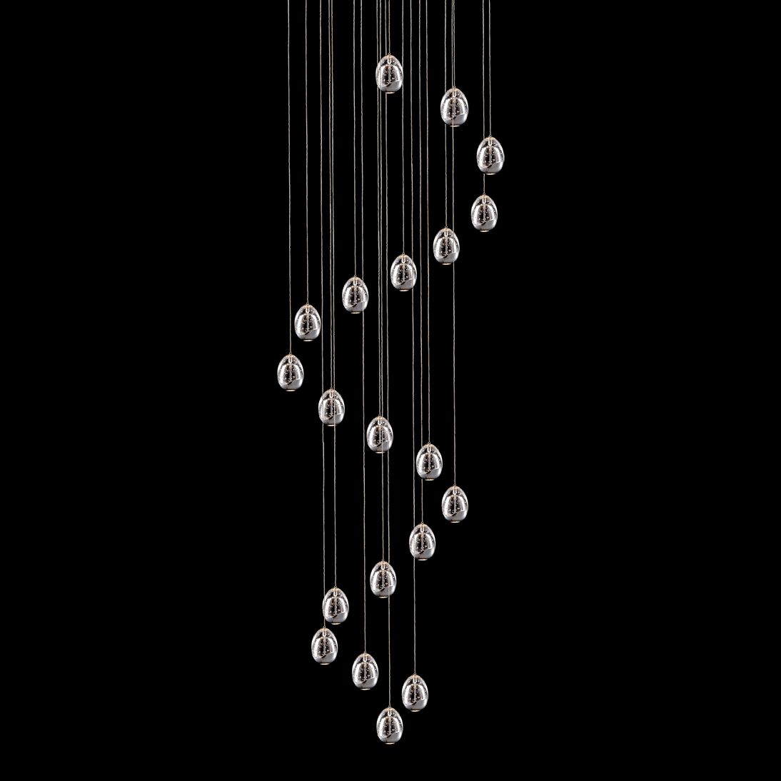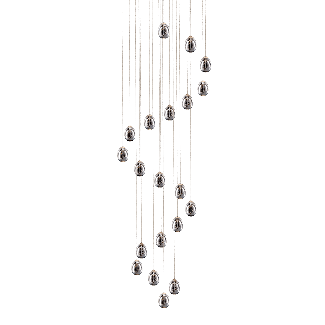 This 20 light LED ceiling pendant features a large circular ceiling plate in a chrome finish with thin suspension wires holding decorative chrome and bubble glass shades.
