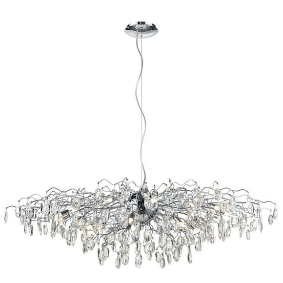 In chrome finish with a mass of crystal glass drops. Suitable for dimming if used with mains voltage halogen lamps. LED G9 lamps should be used but suitability for dimming will depend on the lamp and switch used.