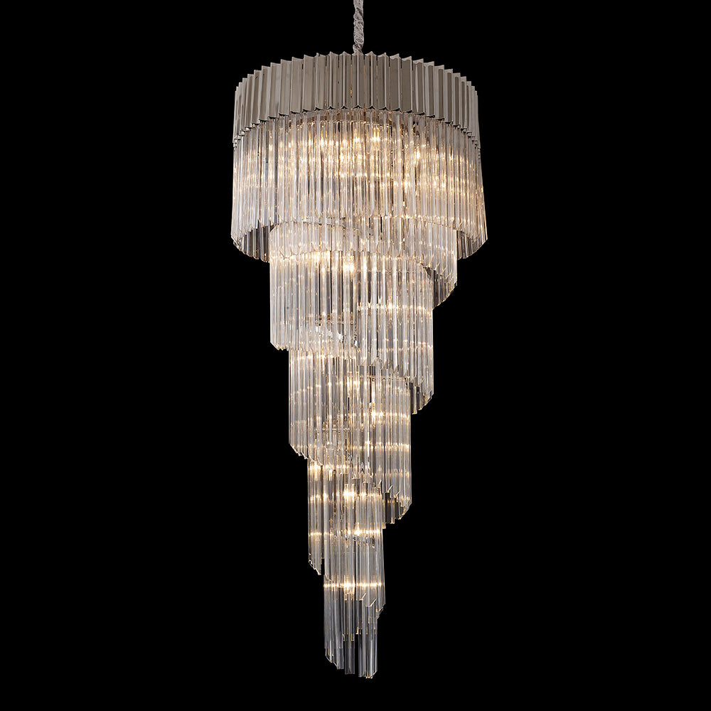 The popularity of this collections initial release has been so overwhelming that the collection has now been extensively expanded to meet a wider range of specification needs. This contemporary design which originally combined a traditional brass finish with clear sculptured glass pieces, now offers a polished nickel or matt black finish with either clear, cognac or smoked glass. The long angular shape of the glass which are in a tiered form, can now be found on larger more dramatic designs including a five tier and rectangular pendant to name only a few. This range has a traditional regal effect composed with modern materials to create a range suitable for either a modern or more traditional room setting. The unique pyramid forms protruding from the frame provide an intriguing overall shape across this comprehensive collection.