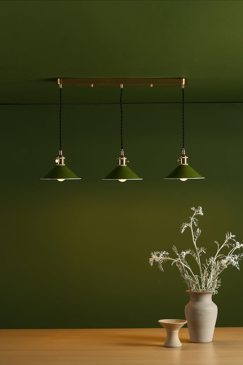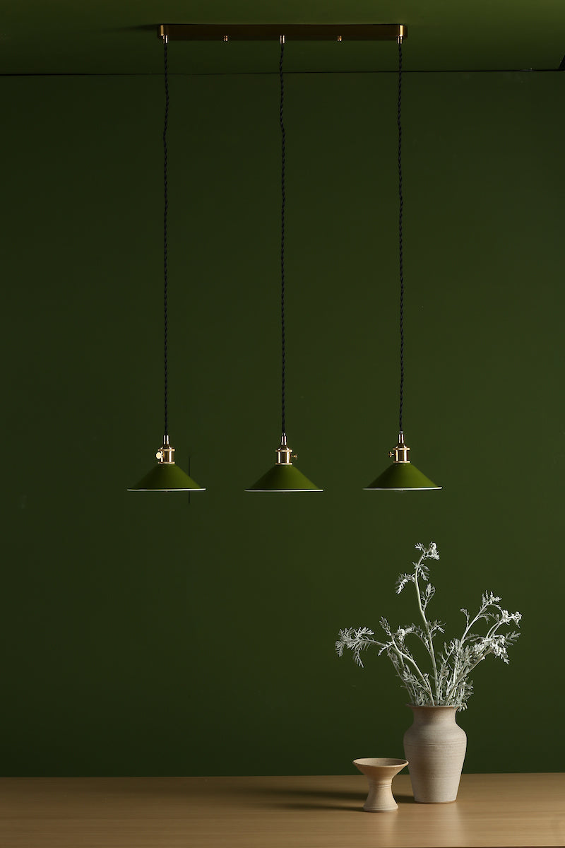 This all-metal version has a vintage-look cone shade in an earthy olive green finish and white inner, complemented by a sophisticated natural brass finish ceiling rose and machined lamp holder.