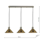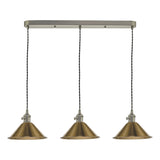 This all-metal version has a trio of vintage-look cone shades of spun steel with rolled edges, finished in aged brass, complemented by the sophisticated antique chrome ceiling bar and lamp holders.