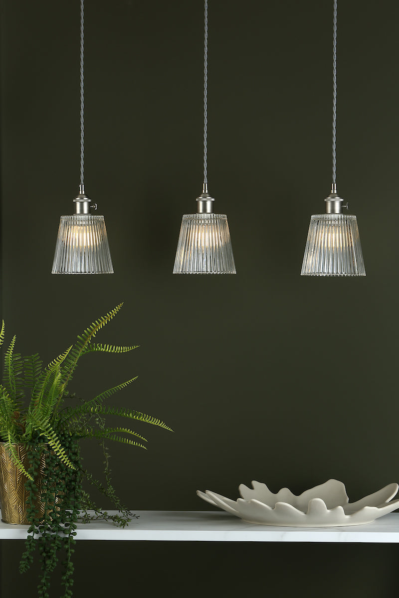 This version has a trio of vintage-look straight-sided jar shade in waterfall ribbed glass, complemented by sophisticated antique chrome ceiling bar and lamp holders.