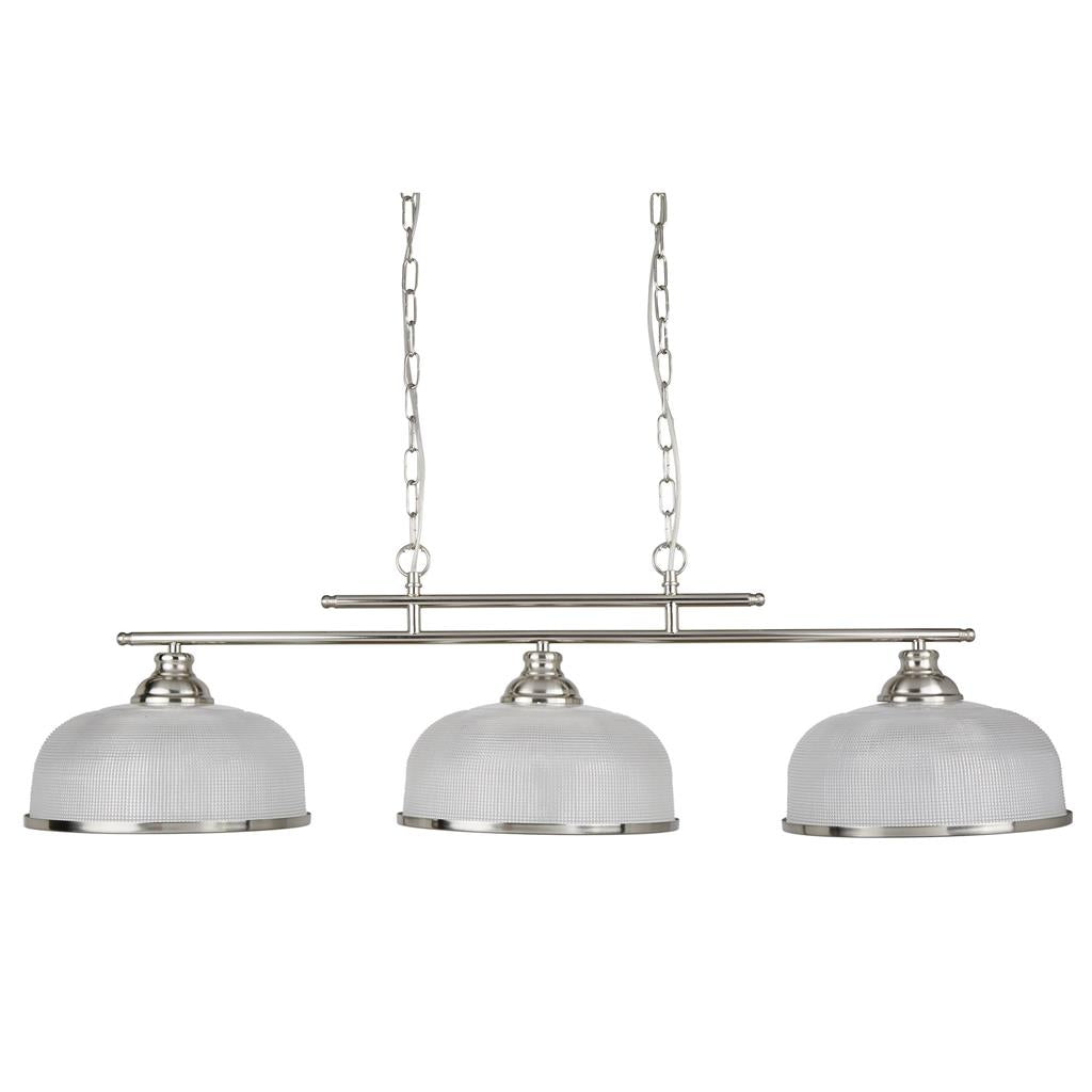 This long 2 part bar suspends to 3 lights that sit within halothane glass shades. The satin silver trim adds an additional classic touch to this item. Attach to kitchen or dining room ceilings and impress your guests.