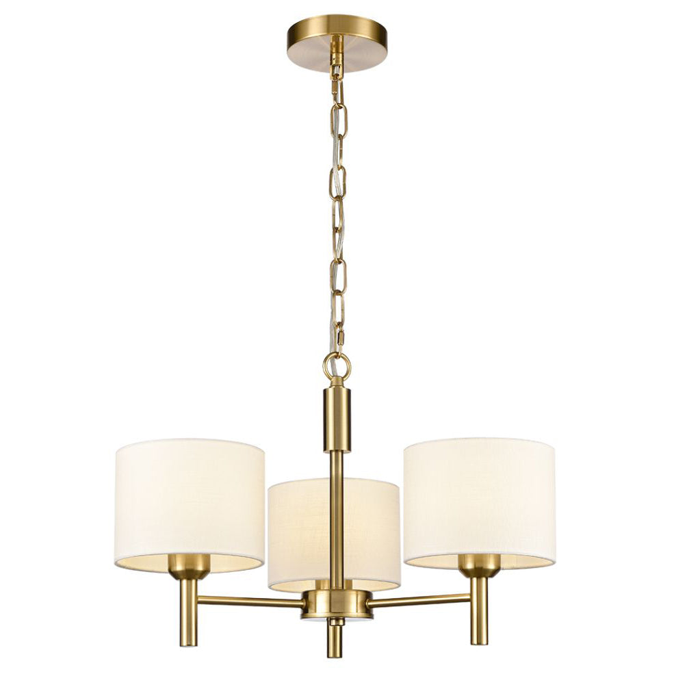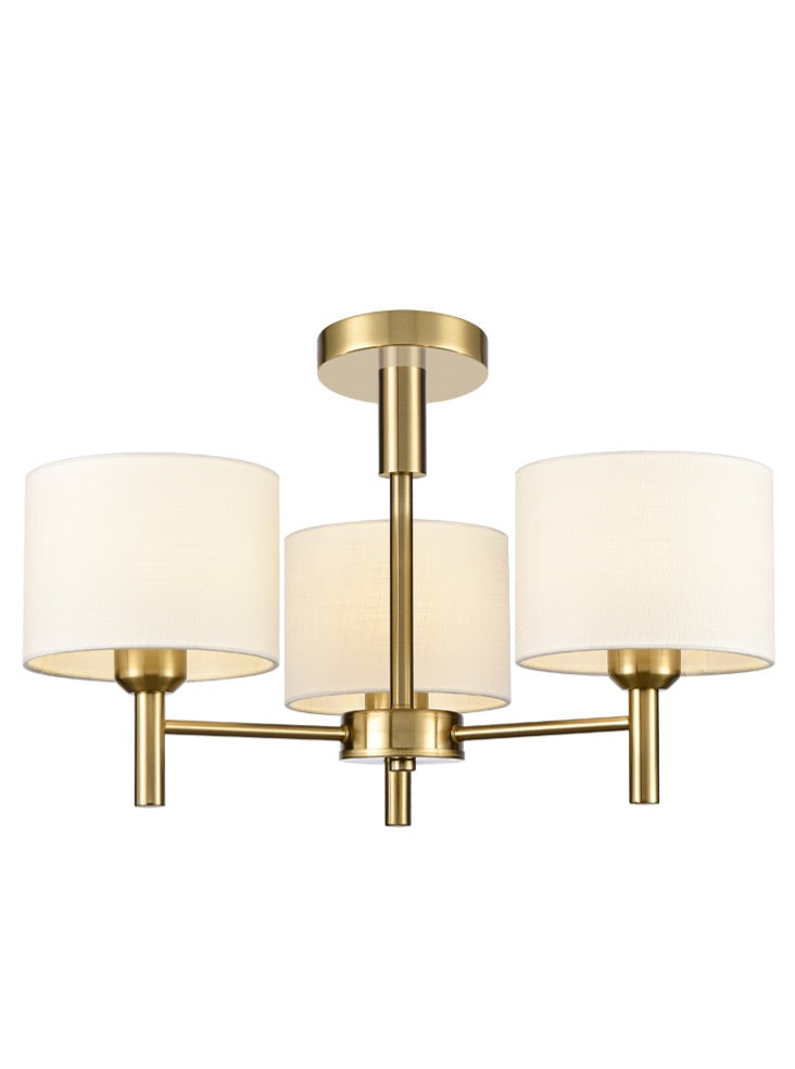 Aged brass finish 3-light fitting with cream textured fabric shades. The three and five light fittings are supplied with chain suspensions which can be converted to flush fittings suitable for low ceilings as illustrated.