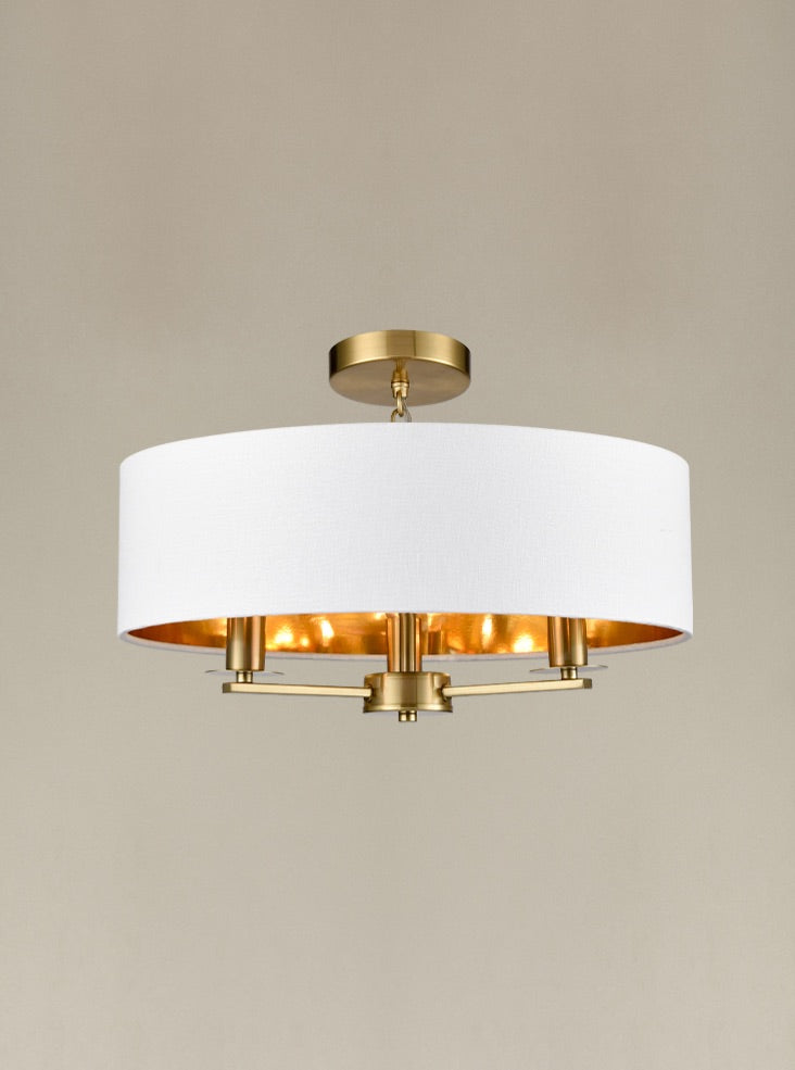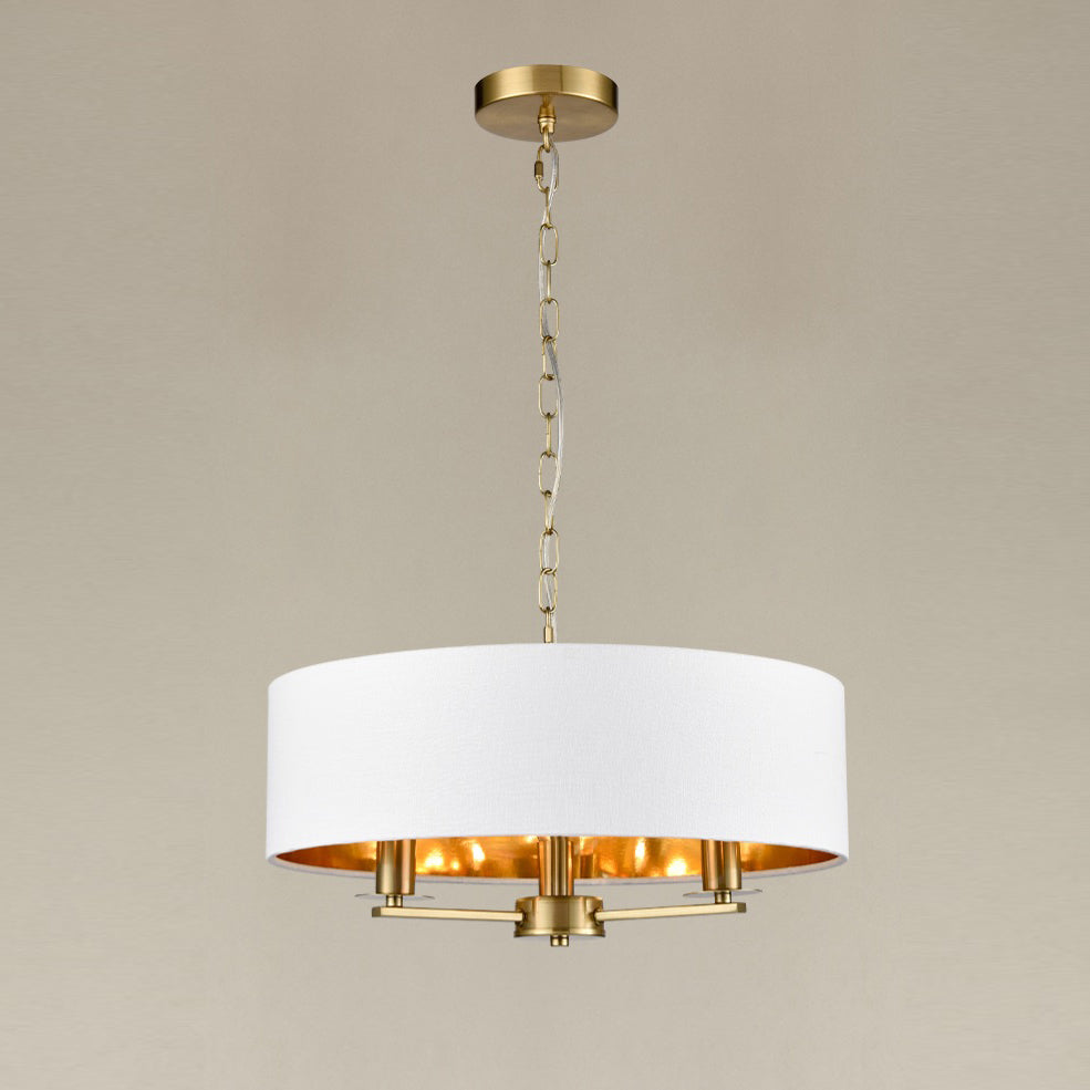 Aged brass finish pendant with cream textured fabric shades and brushed gold inner lining. This pendant is supplied with a chain suspension which can be shortened to accommodate low ceilings.