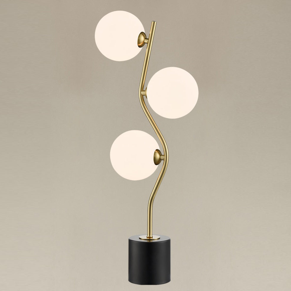 Antique gold finish 3-light table lamp with opal glass spheres and black base. There is an in-line switch on the cable.