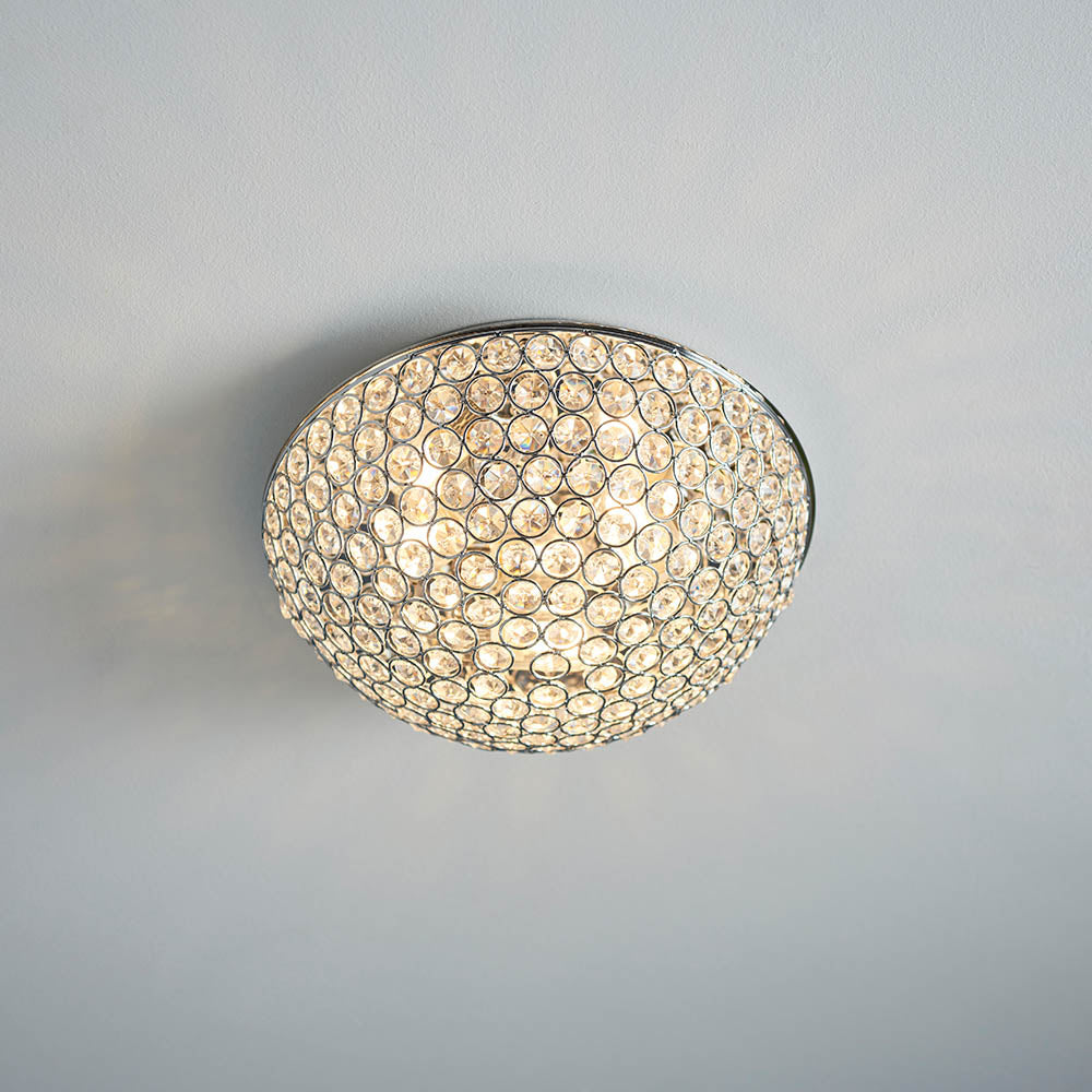 This flush light is IP rated making it ideal for use within the bathroom. This fitting is suitable for use with LED lamps, dimmable and finished in chrome effect plate with clear crystal detailing